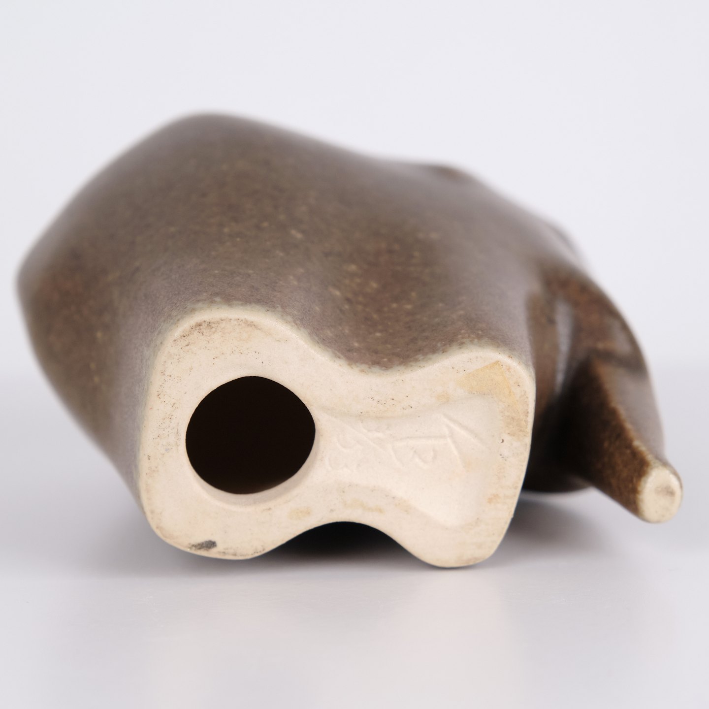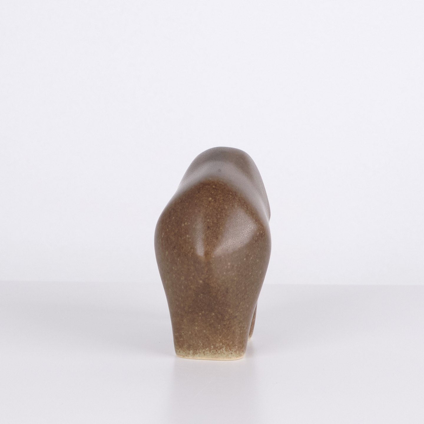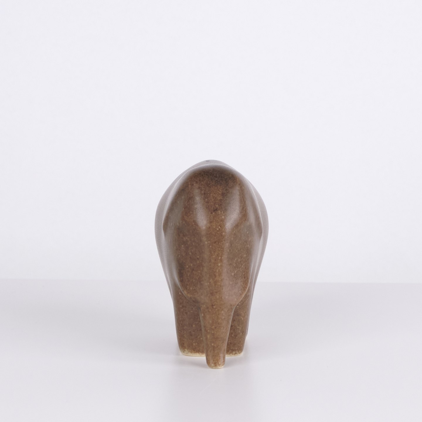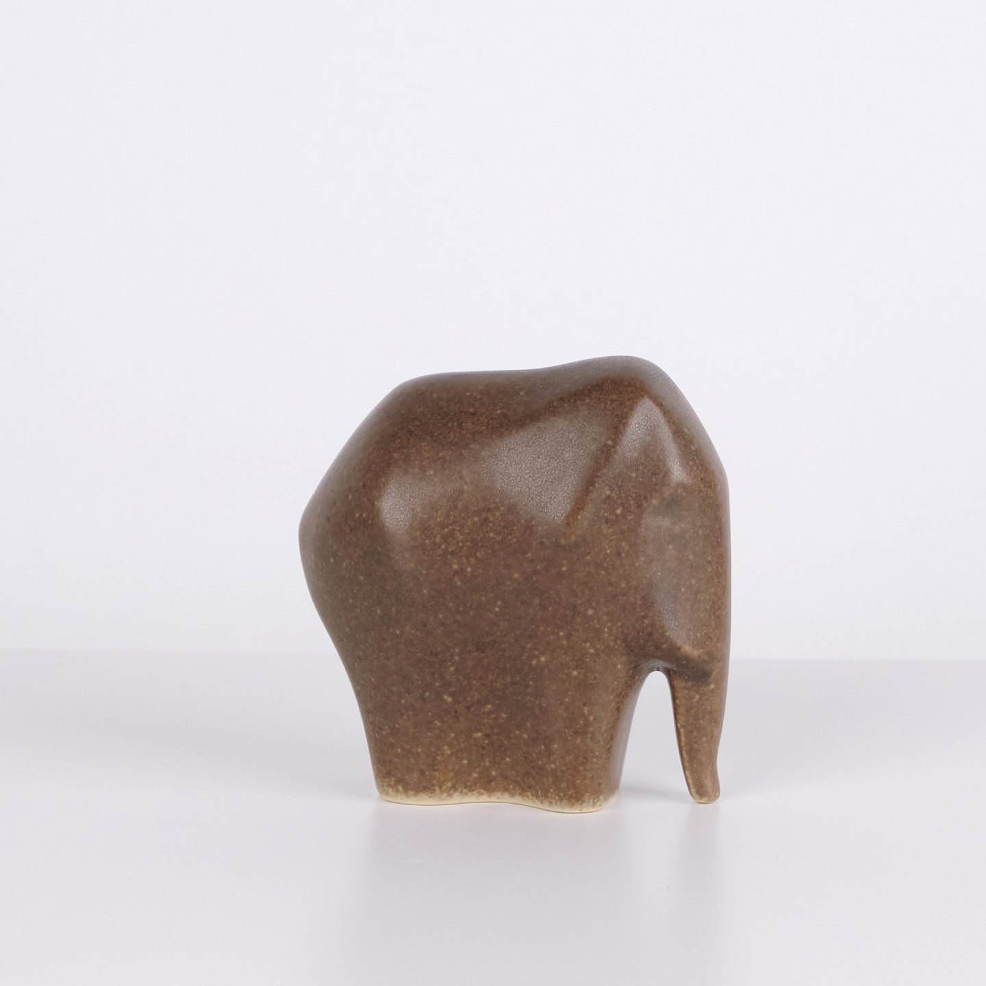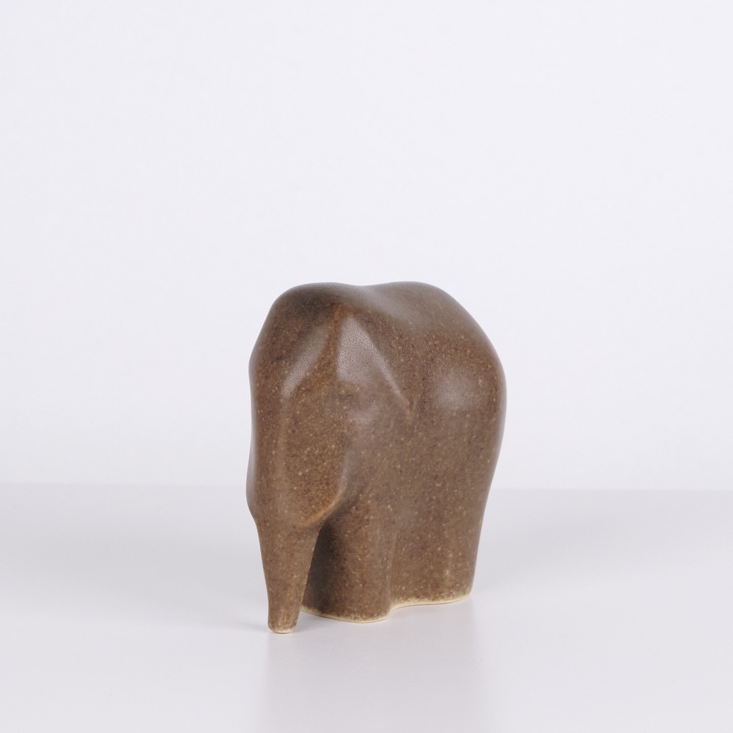 Elefantenfigur von Knud Basse aus braun glasierter Keramik. Die Figur ist in einfacher kompakter Form mit nach unten gebogenem Rüssel und abgerundeten Seiten modelliert. Minimalistisches Modell aus Knud Basses Serie von Tierfiguren, hergestellt in Dänemark in den 1960er Jahren.— Herkunft: Dänemark