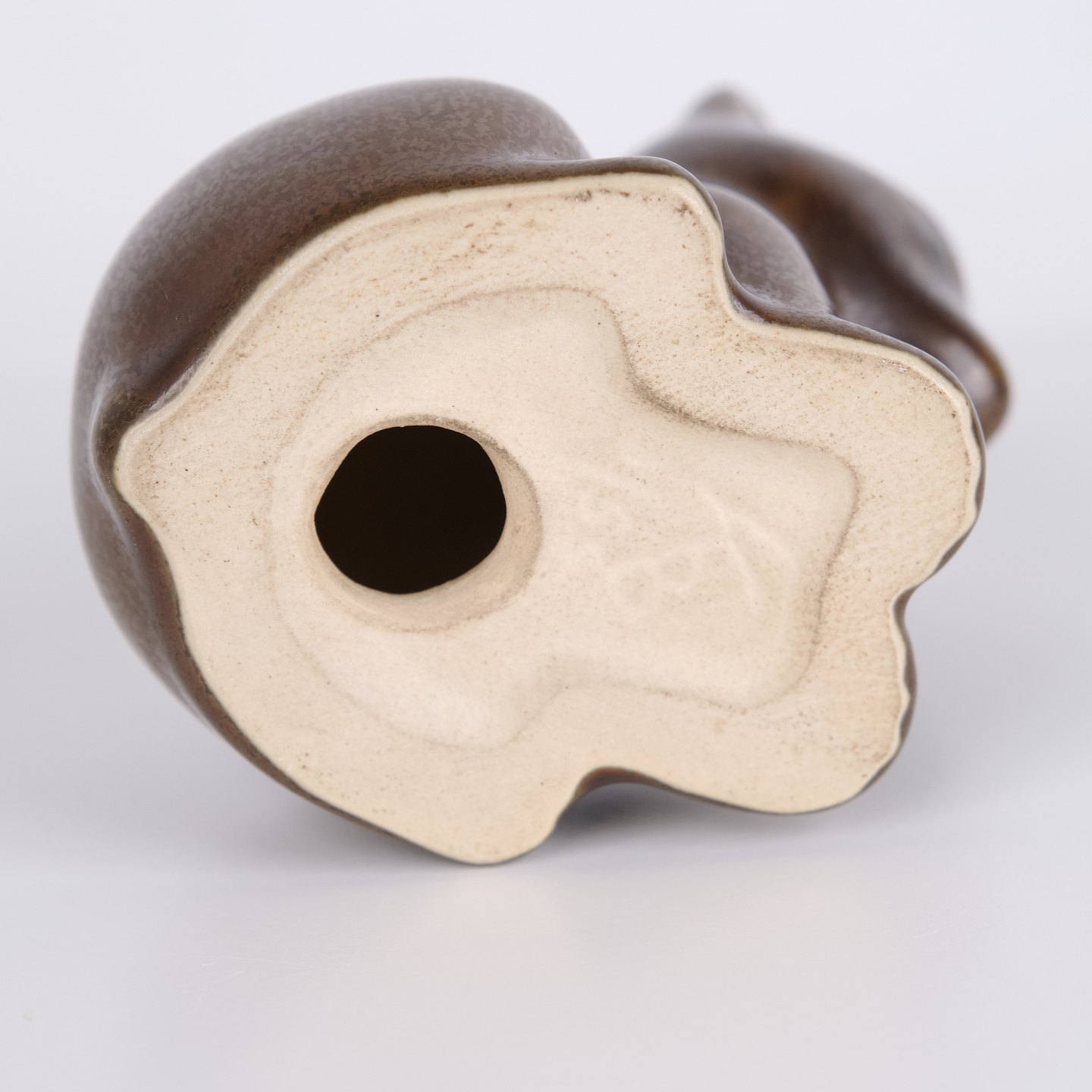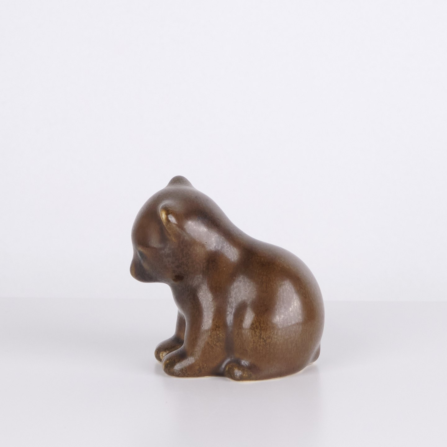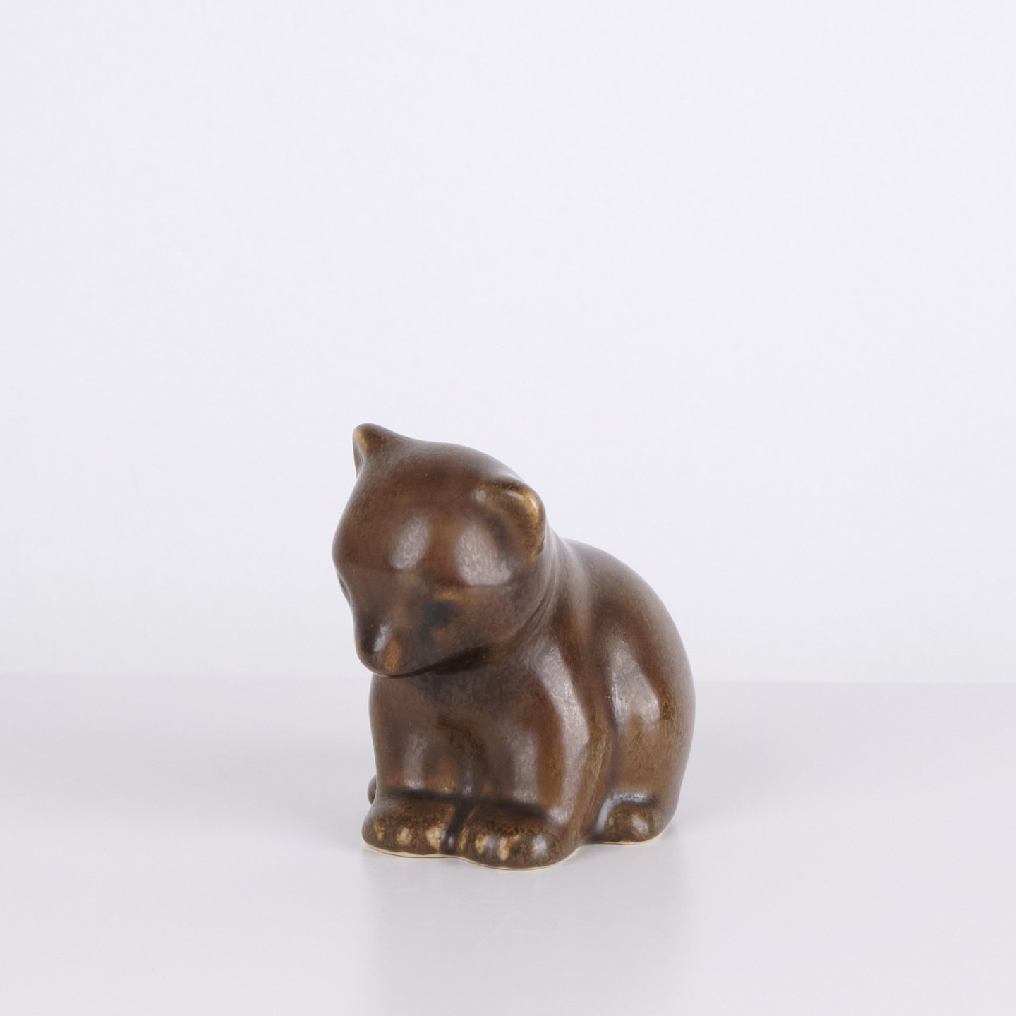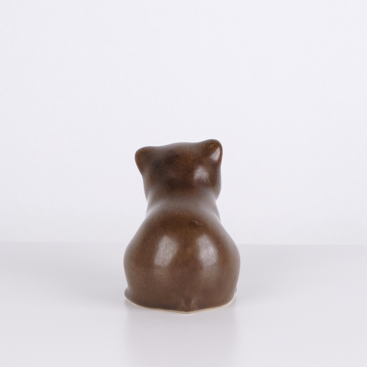 Bärenfigur von Knud Basse aus braun glasierter Keramik. Die Figur ist in sitzender Form mit leicht geneigtem Kopf und abgerundeten Linien modelliert, was ihr einen ruhigen und charaktervollen Ausdruck verleiht. Ein schönes Beispiel für Knud Basses beliebte Tierfiguren und dänische Kunstkeramik aus der Mid-Century-Periode.