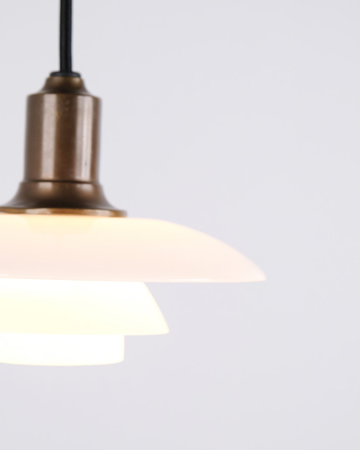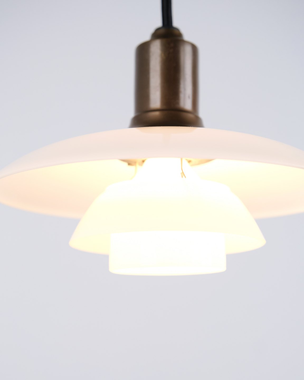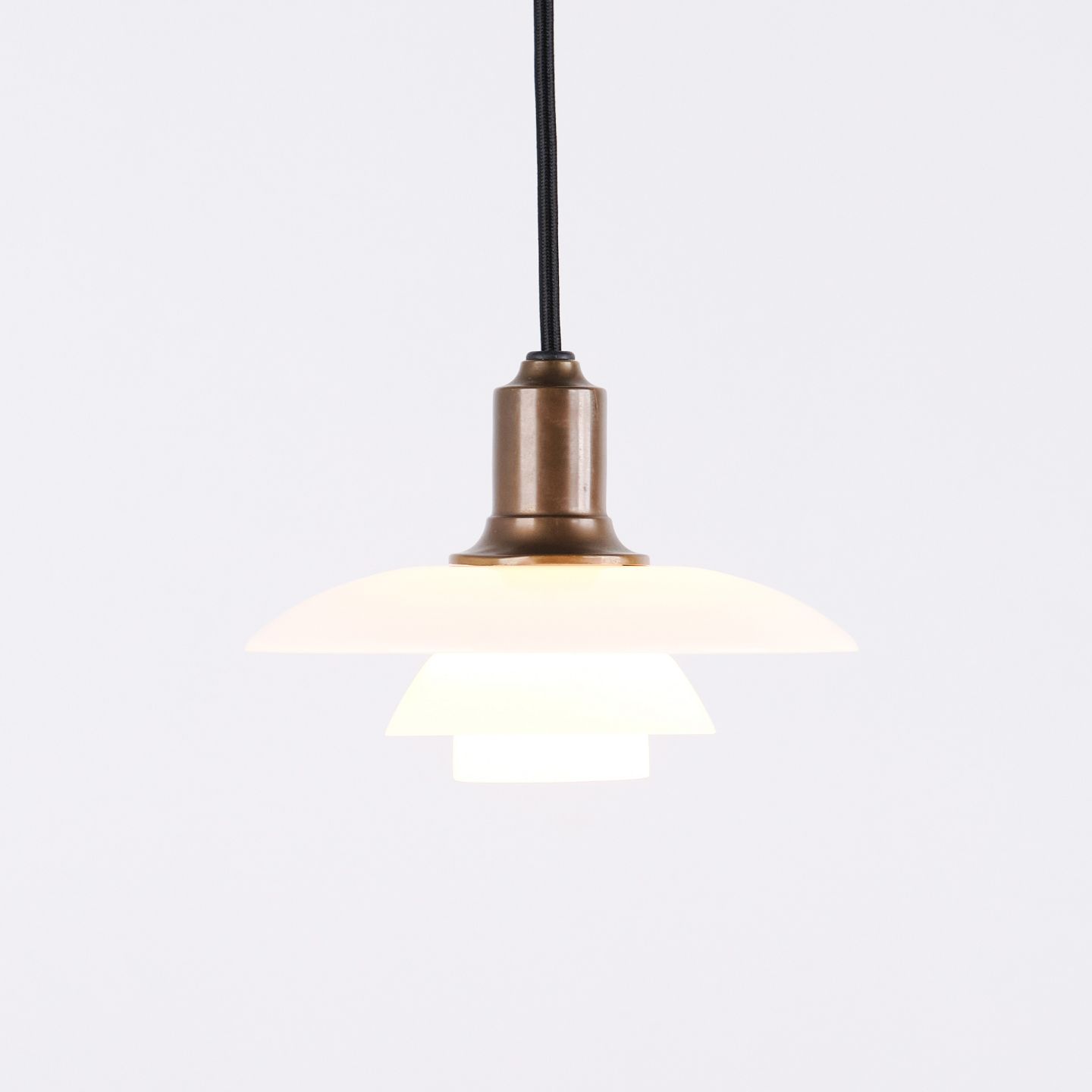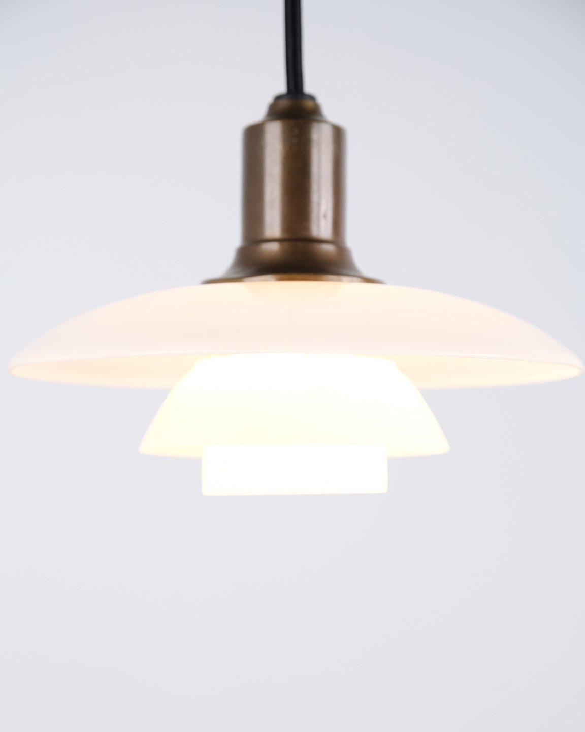 PH 2/1 Pendelleuchte, entworfen von Poul Henningsen und hergestellt von Louis Poulsen. Die Leuchte ist aus brüniertem Messing mit drei Schirmen aus weißem Opalglas gefertigt.— Herkunft: Dänemark