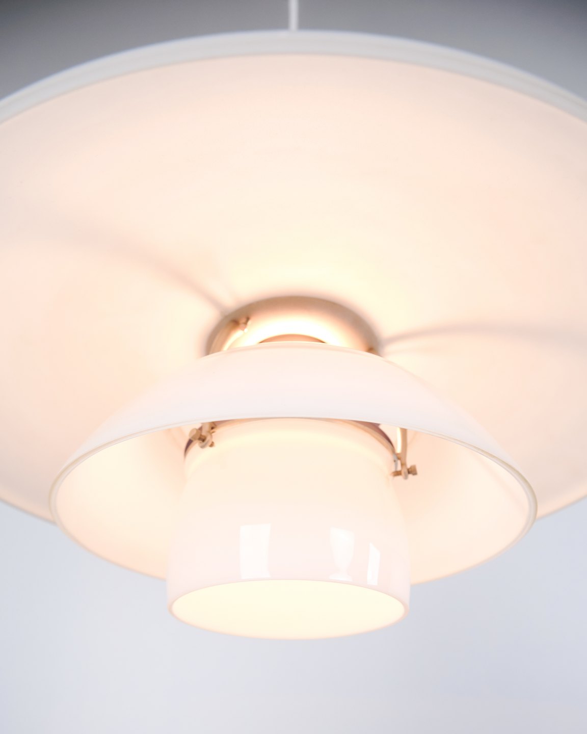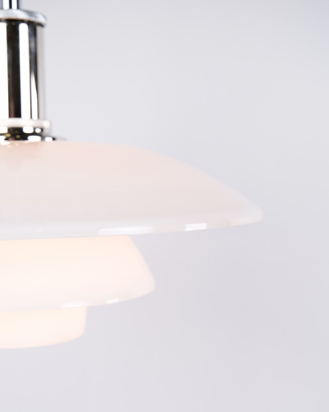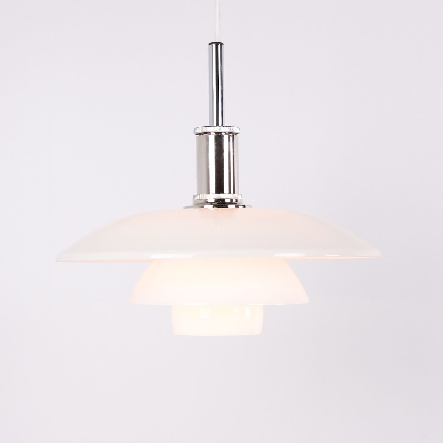 PH 4½-4 Pendelleuchte, entworfen von Poul Henningsen für Louis Poulsen. Die Leuchte ist mit mundgeblasenen Dreischirmen aus weißem Opalglas und Chromaufhängung gefertigt. Das Modell besitzt einen oberen Schirm von ca. 45 cm und verwendet die unteren Schirme der PH 4/4 Serie, entwickelt für eine breitere Lichtverteilung bei niedriger Aufhängung über Esstisch oder Tischfläche. Die heutige Version wurde 1980 eingeführt und ist Teil des ikonischen blendfreien PH Beleuchtungssystems.— Herkunft: Dänemark