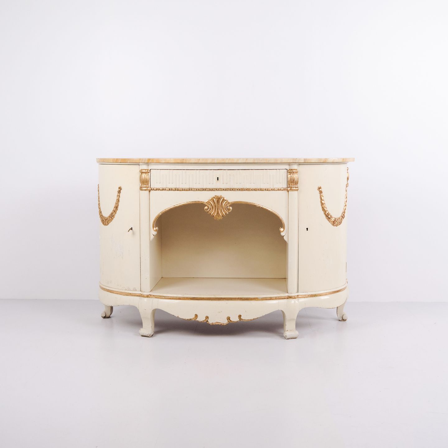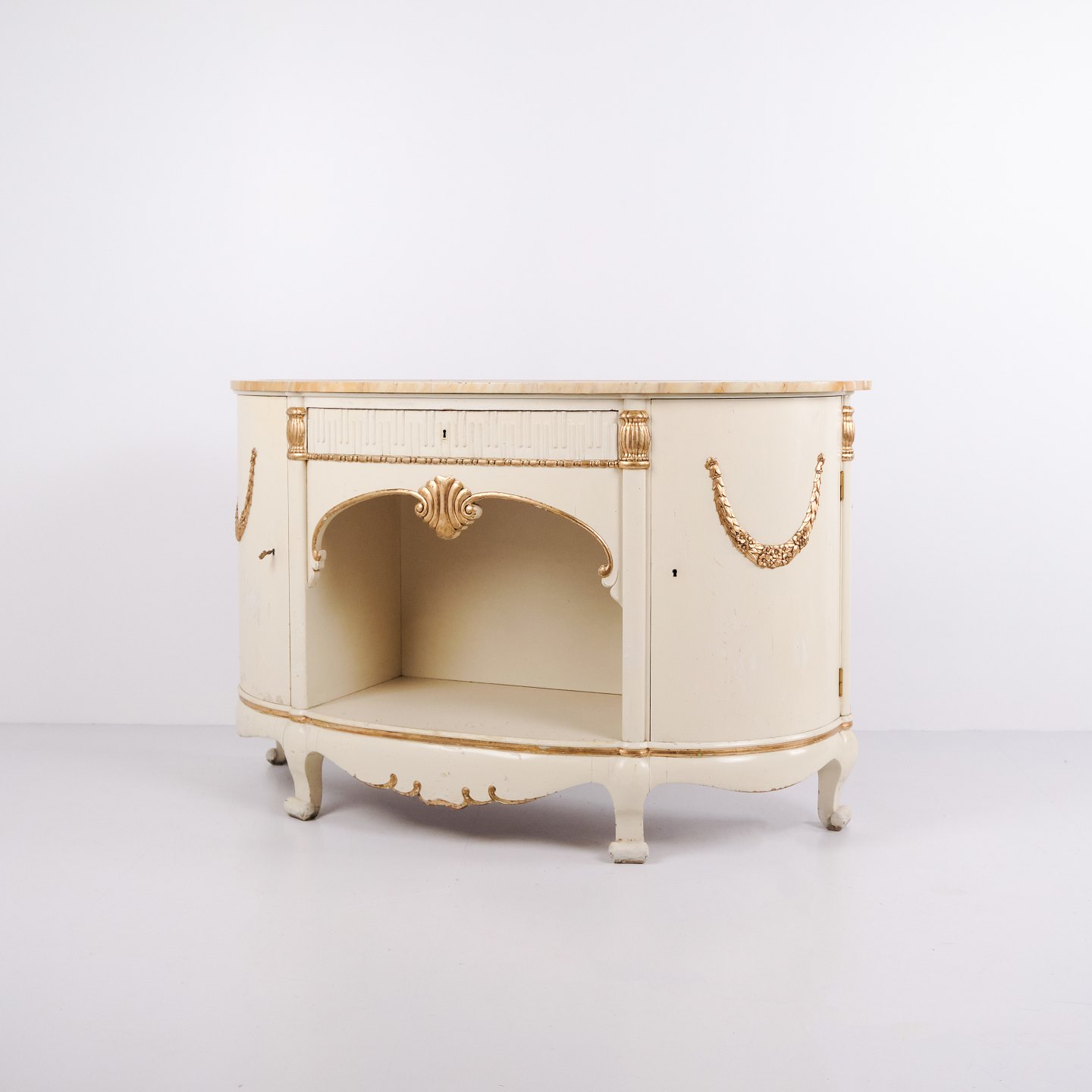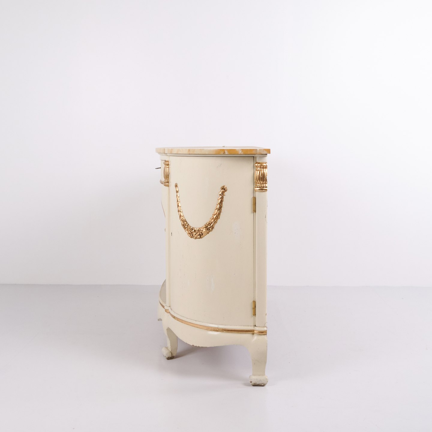 Gebogenes Sideboard gefertigt von P. Svensen, N. Frihavnegade 15, Kopenhagen. Das Möbel ist aus bemaltem Holz mit profilierten Details, vergoldeten Dekorationen und originaler Marmorplatte gefertigt. Die Front verfügt über ein offenes Mittelfach, eine kleine Schublade sowie zwei gebogene Schranktüren mit Innenböden. Klassische empireinspirierte Form mit gebogenen Seiten, geschwungenen Beinen und dekorativen Beschlägen. Geeignet als Flurmöbel, Konsole oder Aufbewahrungssideboard.— Herkunft: Dänemark