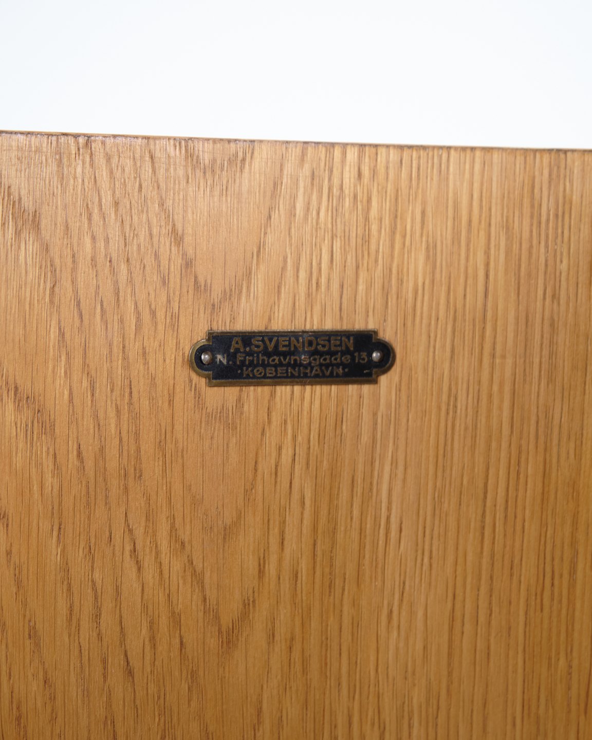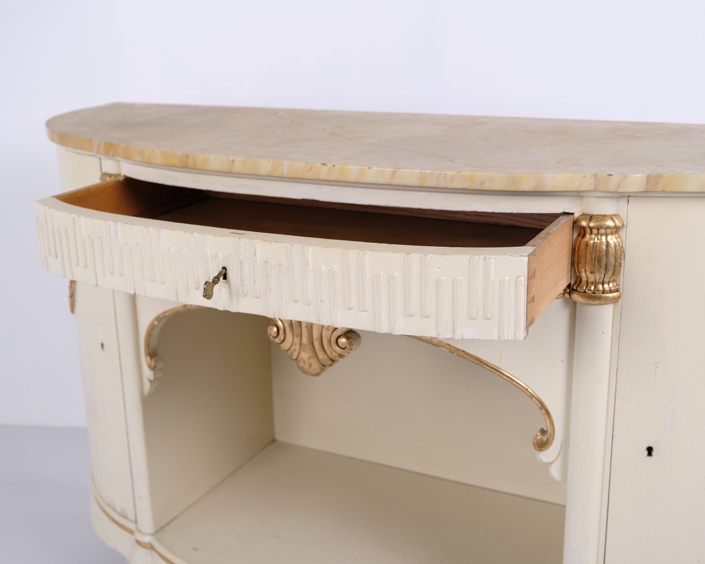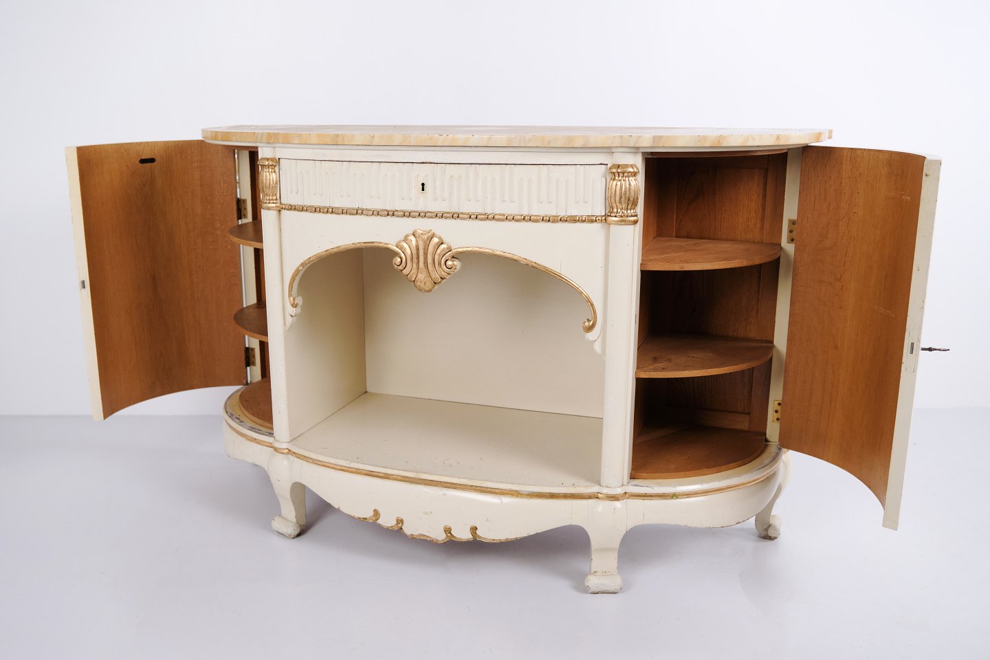 Gebogenes Sideboard gefertigt von P. Svensen, N. Frihavnegade 15, Kopenhagen. Das Möbel ist aus bemaltem Holz mit profilierten Details, vergoldeten Dekorationen und originaler Marmorplatte gefertigt. Die Front verfügt über ein offenes Mittelfach, eine kleine Schublade sowie zwei gebogene Schranktüren mit Innenböden. Klassische empireinspirierte Form mit gebogenen Seiten, geschwungenen Beinen und dekorativen Beschlägen. Geeignet als Flurmöbel, Konsole oder Aufbewahrungssideboard.— Herkunft: Dänemark