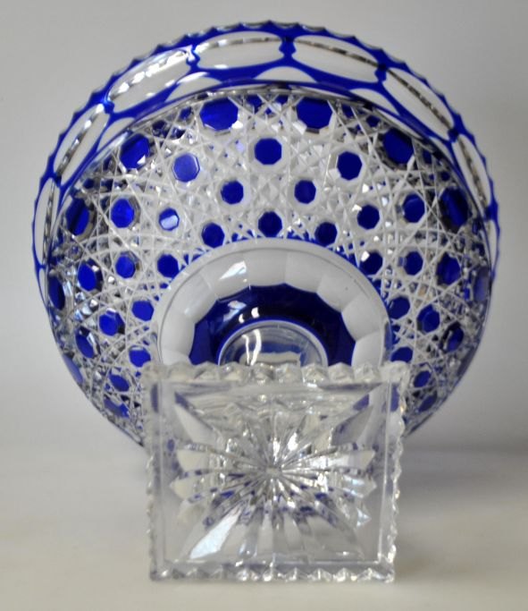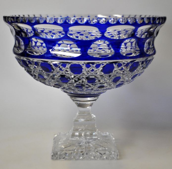 Großes Kristall-Mittelstück, 20. Jahrhundert. Mit blauem Rand. Auf quadratischem Sockel. Höhe: 21 cm. Durchmesser: 24 cm.Bestellnummer: 29048