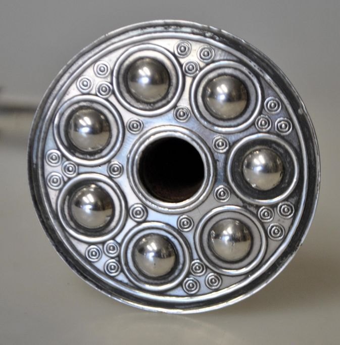 Hingelberg-Lure aus Sterlingsilber, 20. Jahrhundert. Aarhus, Dänemark. Mit bronzezeitlichem Ornament. Länge: 20 cm. Gestempelt: Hingelberg Sterling Denmark 925 S. Gewicht: 81 Gramm.Hinweis: Zwei Anhänger fehlen.