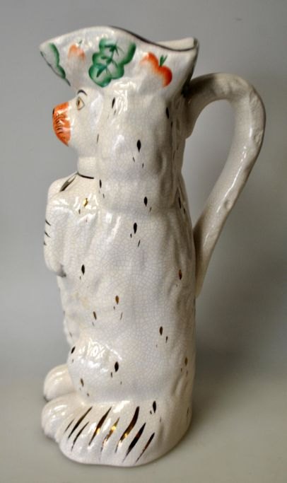 Staffordshire-Hundekanne, England, 19. Jahrhundert. Fayence mit handbemalten Details. Höhe: 25,5 cm.Bestellnummer: 29064