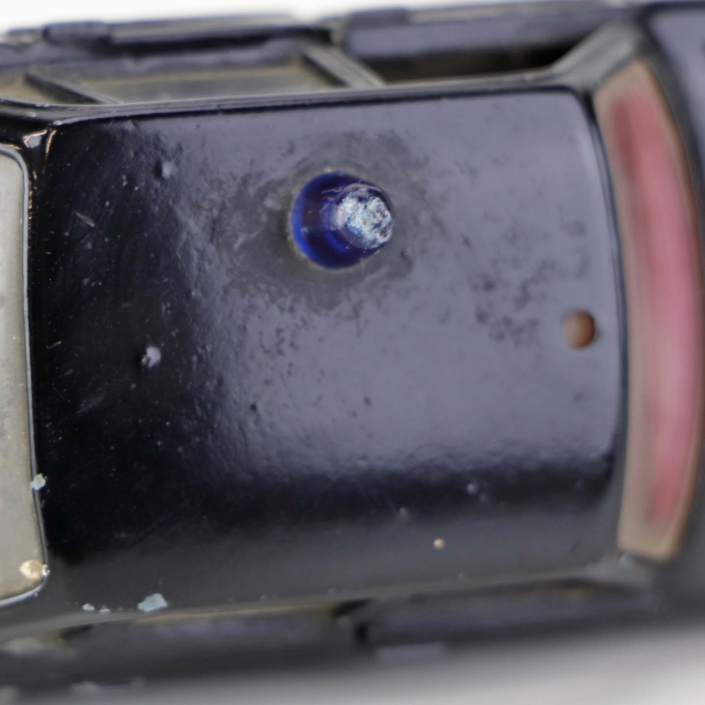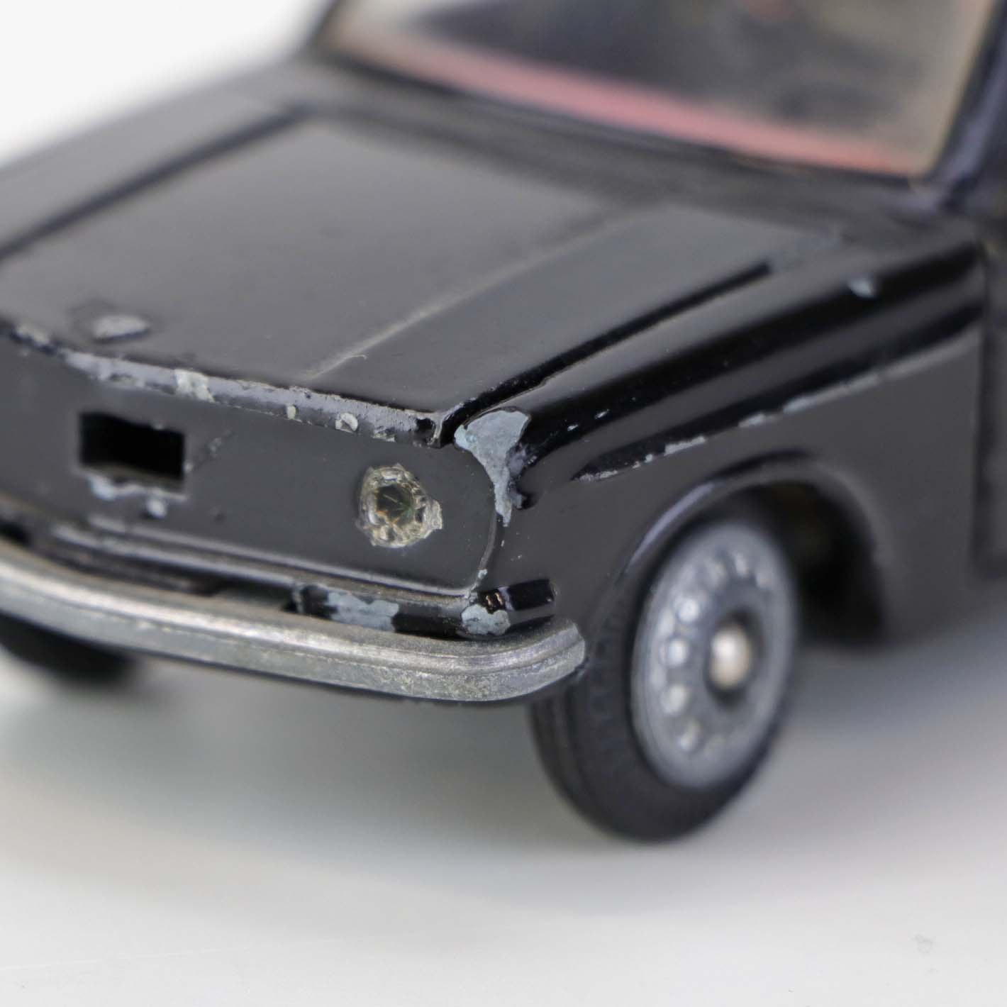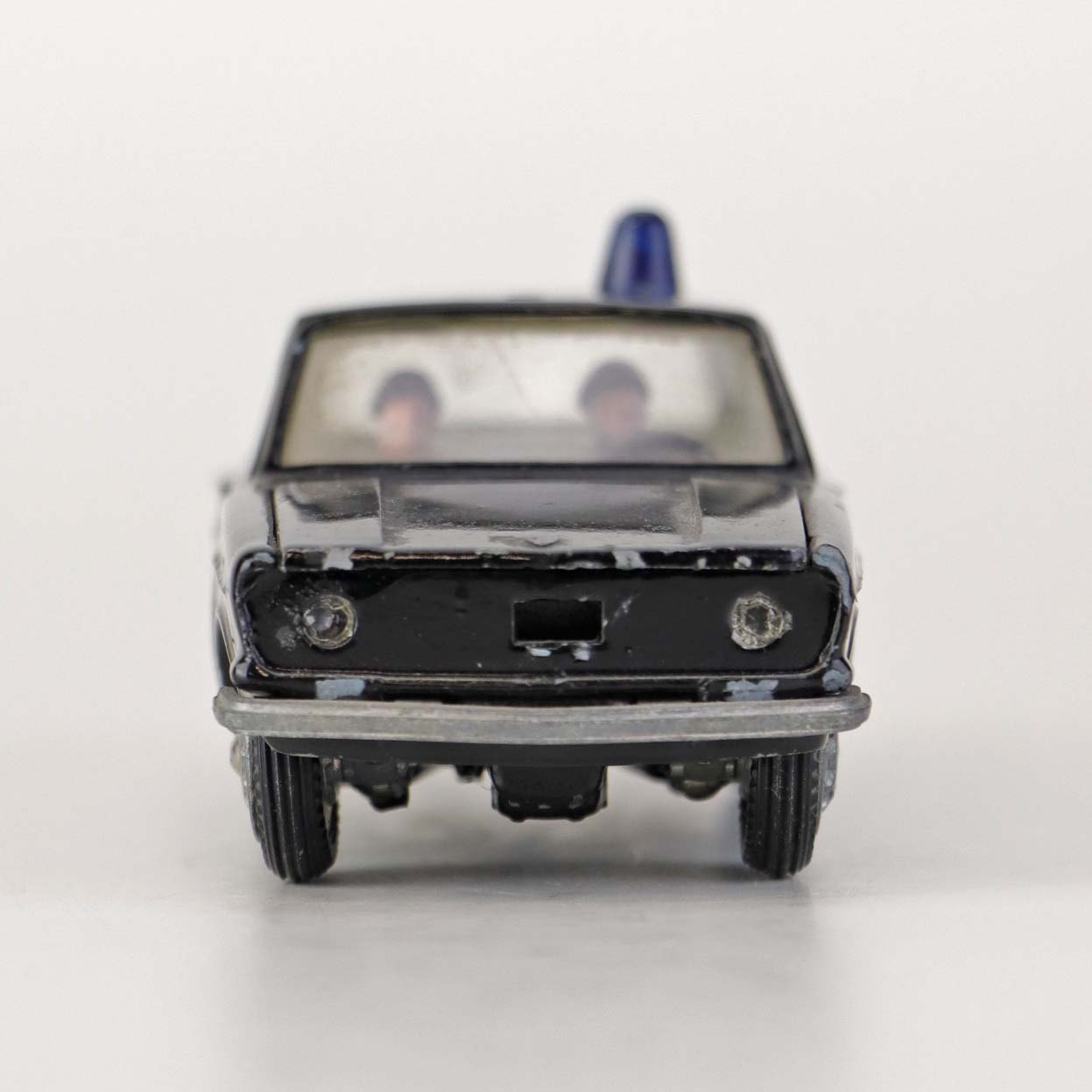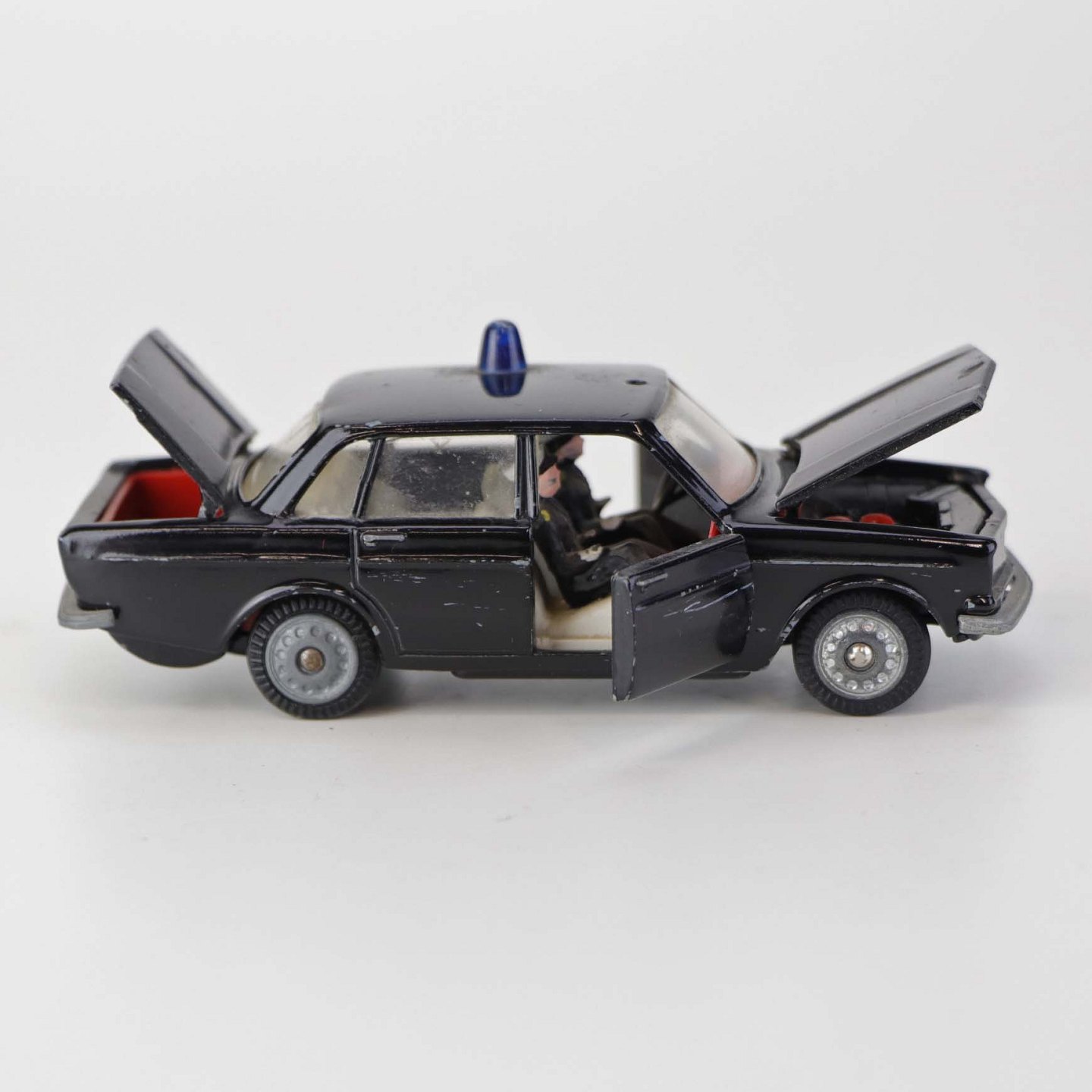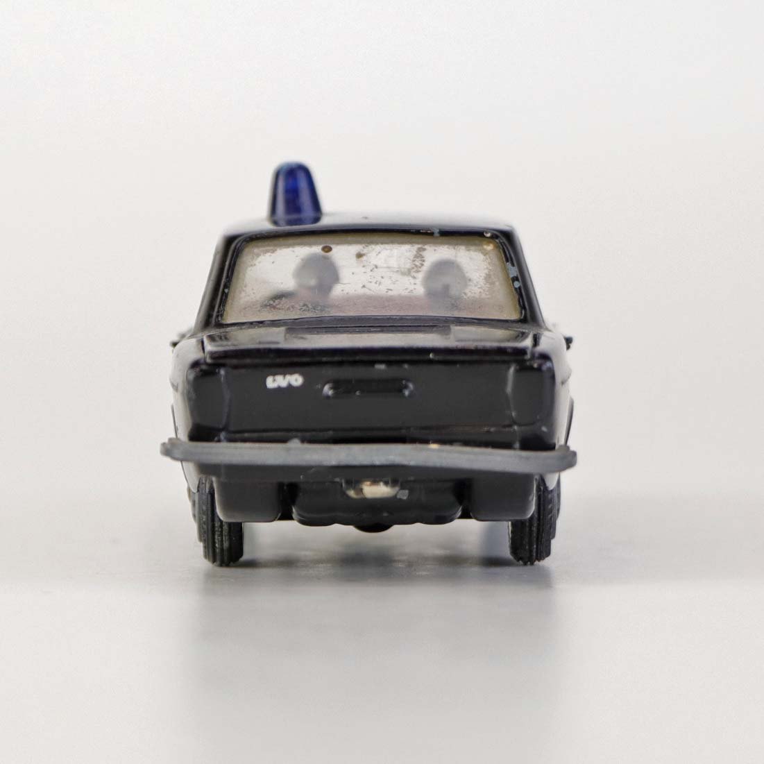 Politibil med to figurer. Legetøjsbil i sortlakeret metal med gummi hjul og blå blinklys. Model Volvo 144 Producent Tekno, Denmark