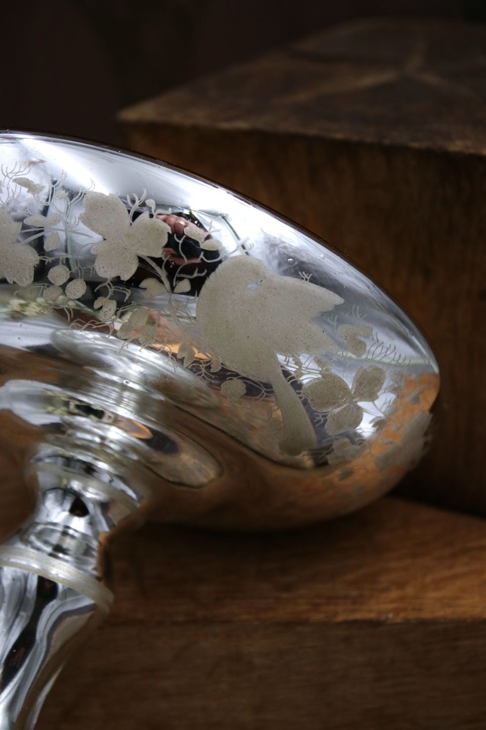 Fransk 1800 tals skål på fod i fattigmandssølv (Mercury glass) med fin ætset dekoration med fugle og bladranker.