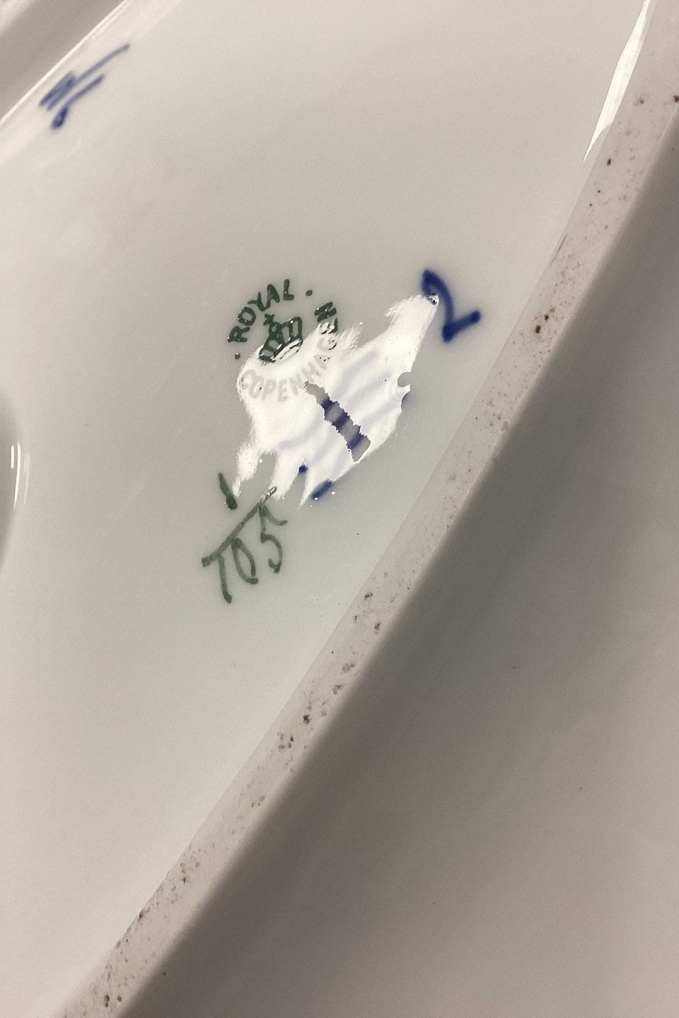Royal Copenhagen Musselmalet Riflet Stort aflangt Fiskefad No. 105. 2. Sortering i fin stand.