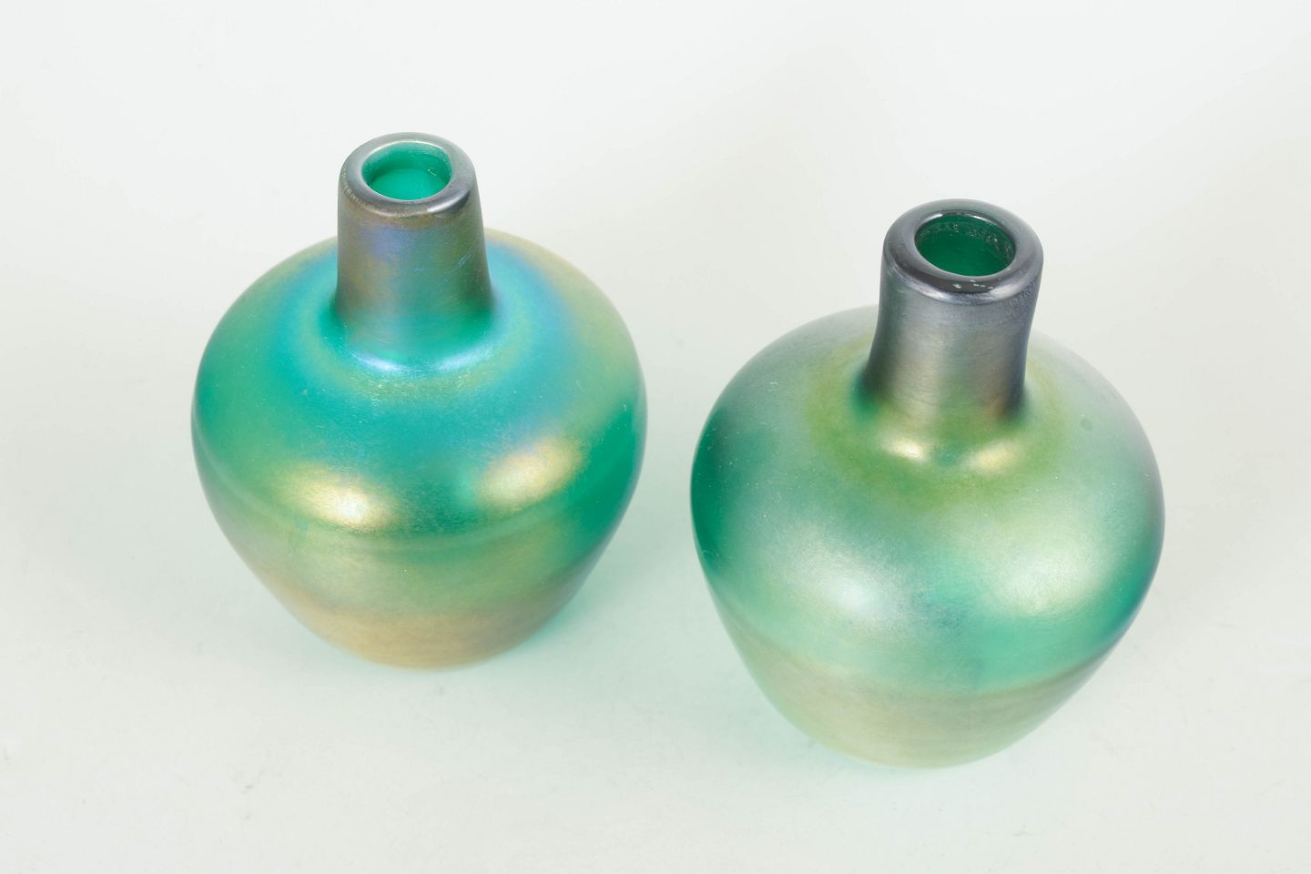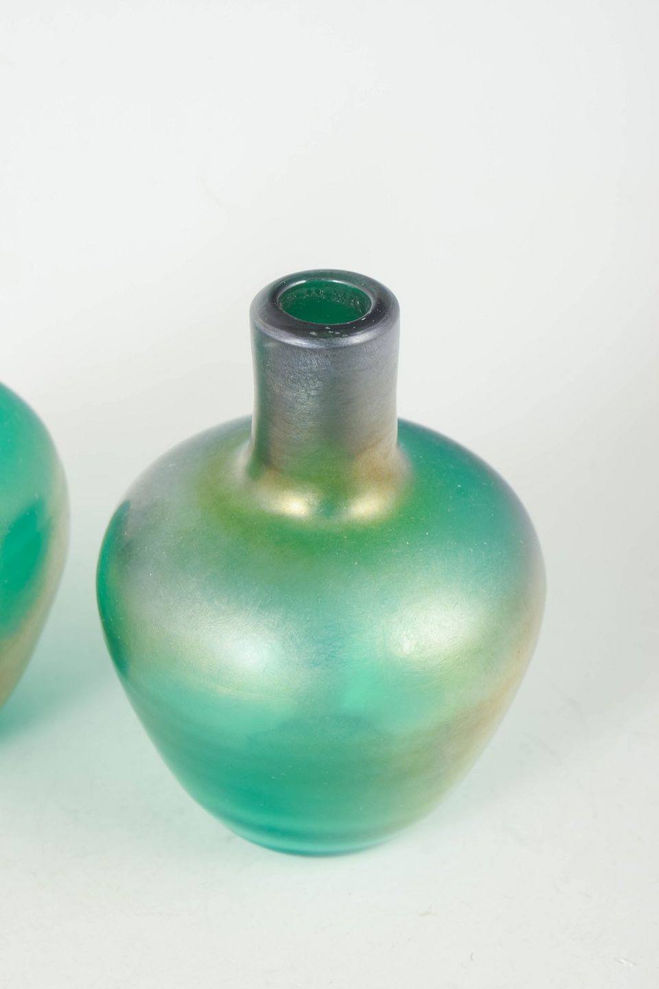 Bertil Vallien for Kosta Boda, par vaser.Elegante mundblæste glasvaser med organisk form og iriserende overflade i grønne og gyldne nuancer, der skifter i lyset.