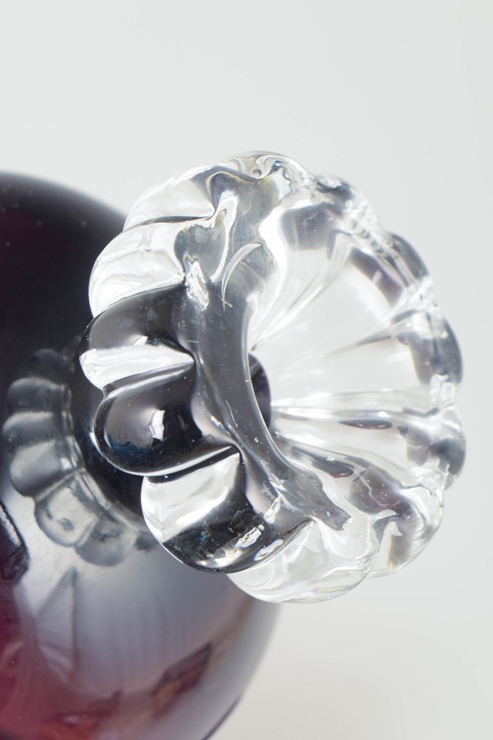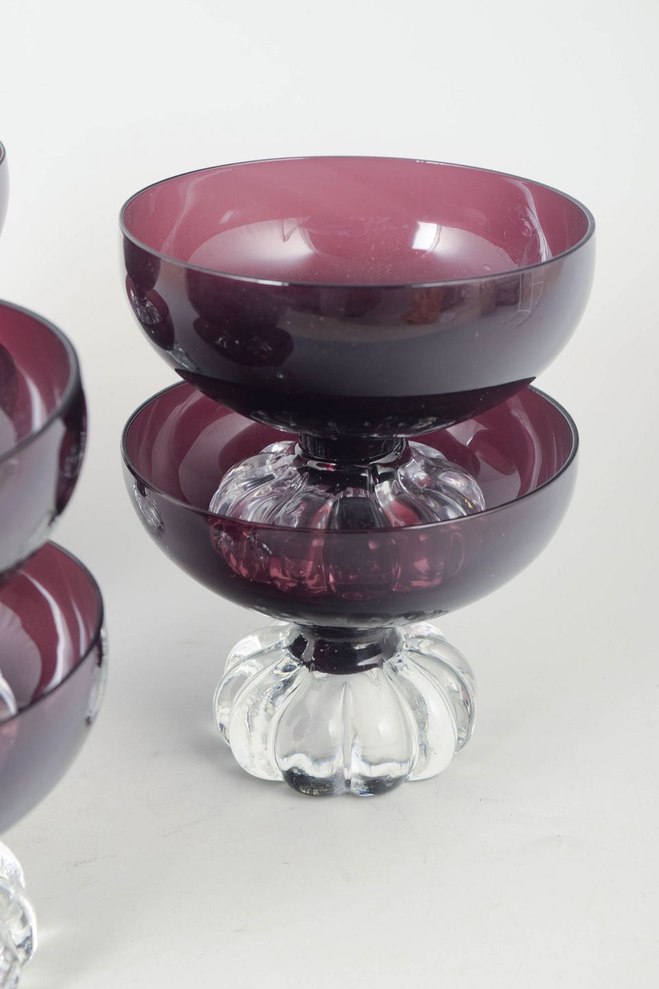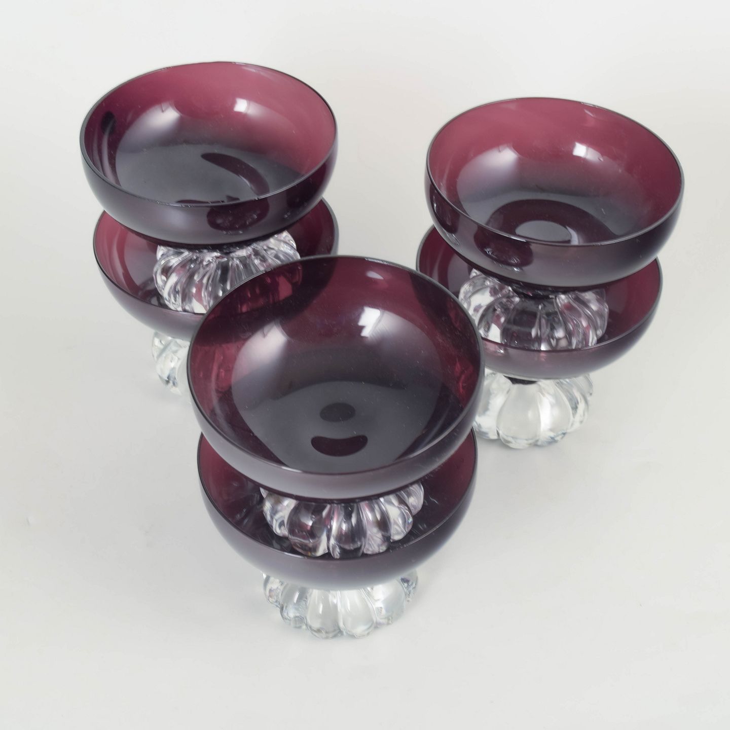 Bo Borgström for Åseda glasbruk, sæt af seks dessertskåle.Elegante dessertskåle i mundblæst glas med dyb ametystfarvet kumme og dekorativ fod i klart glas med rillet struktur, karakteristisk for svensk glasdesign fra perioden.