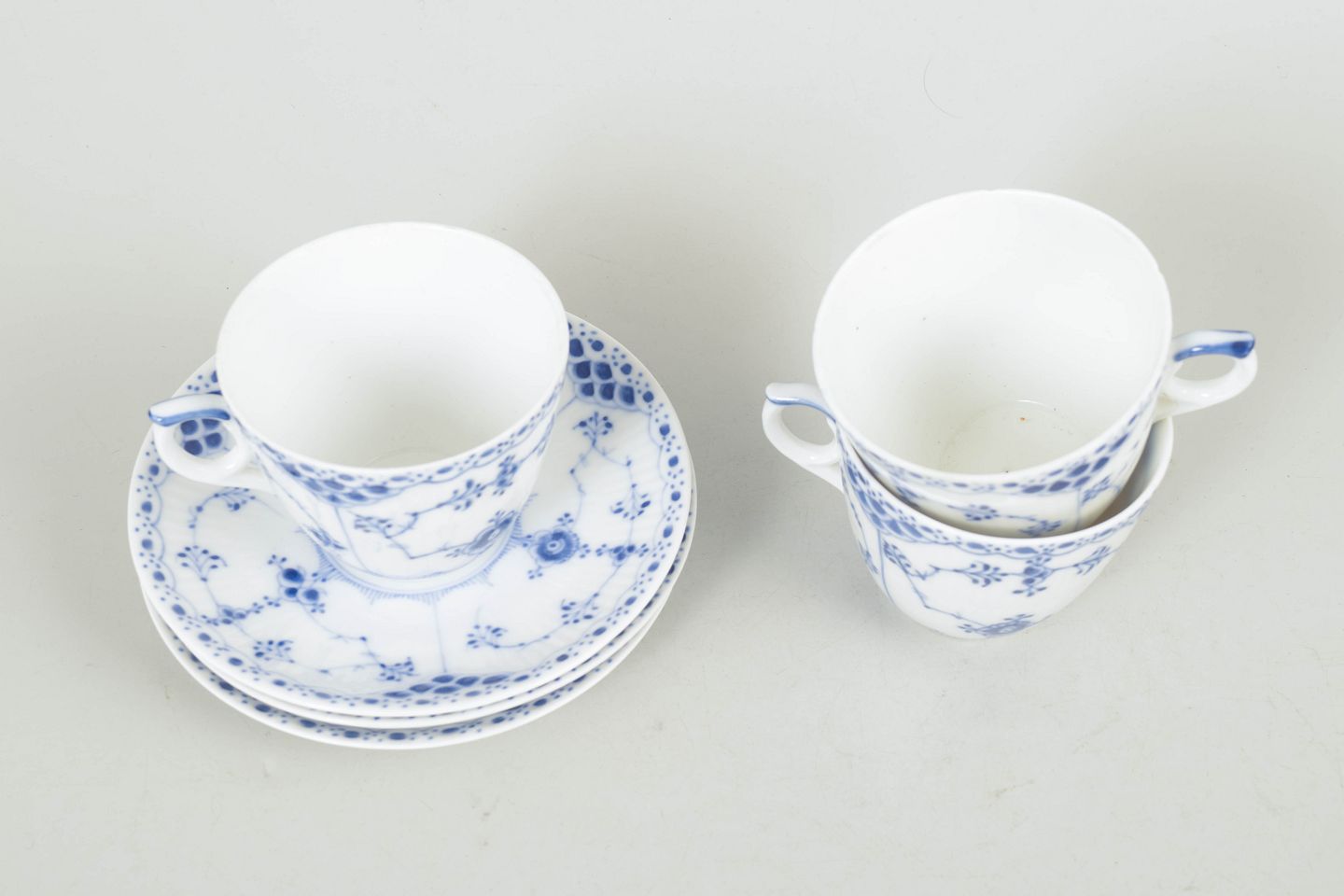 Royal Copenhagen Musselmalet Halvblonde, sæt af tre kaffekopper med underkopper.Beschreibung: