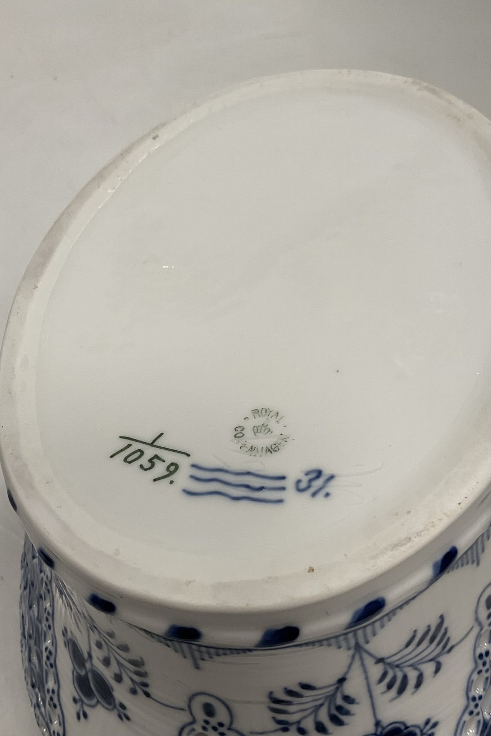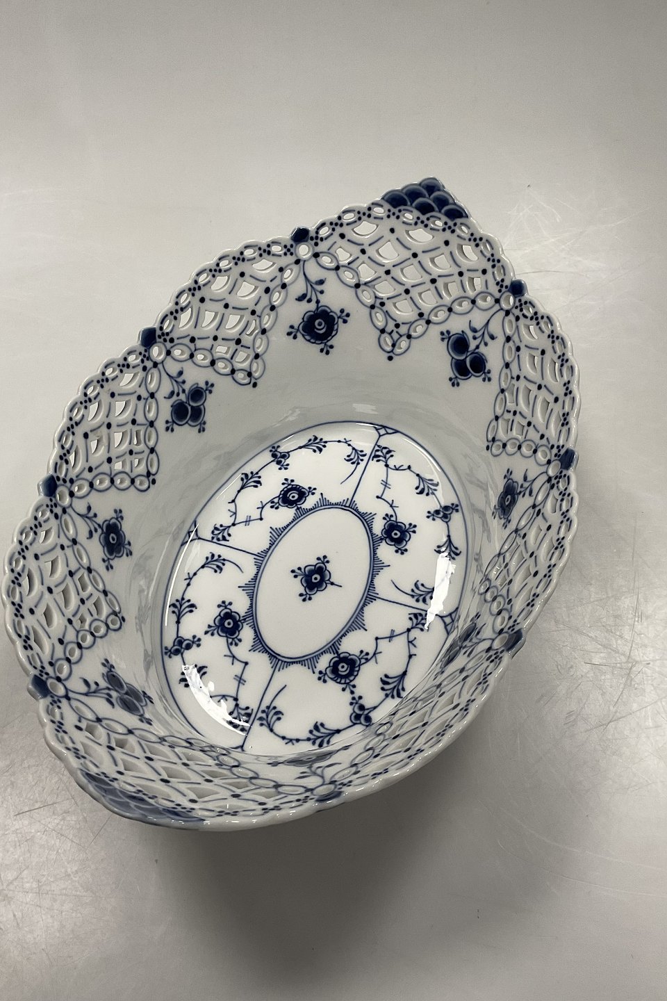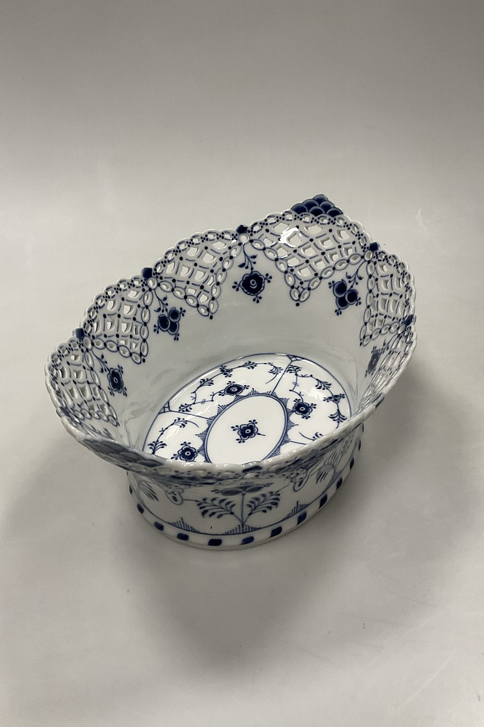 Royal Copenhagen Musselmalet Helblonde Frugtkurv/Oval Skål No. 1059. Modellør Emil Larsen, november 1892.Måler 30 cm x 21 cm / 11.81 in. x 8,26 in. 1.Sortering