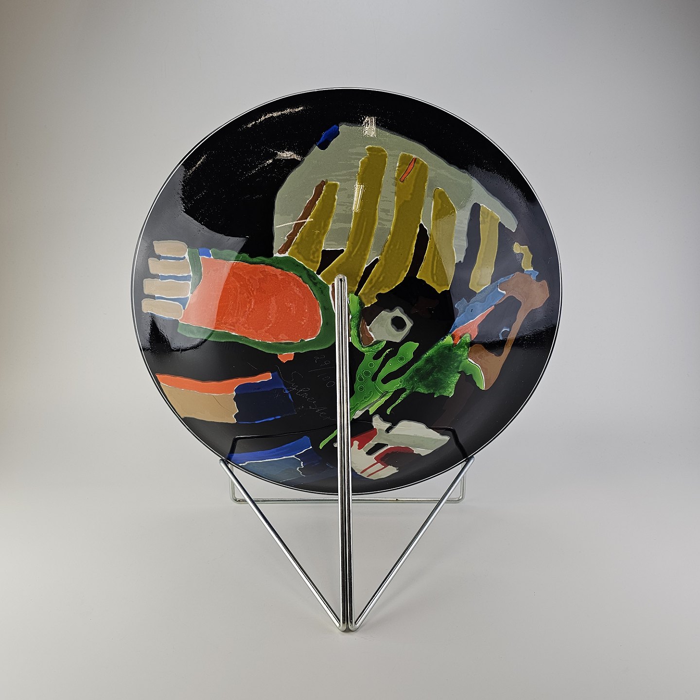 Platte i glas med abstrakt motiv i flere farver på sort baggrundNr. 29/100, medfølgende metal holder.
