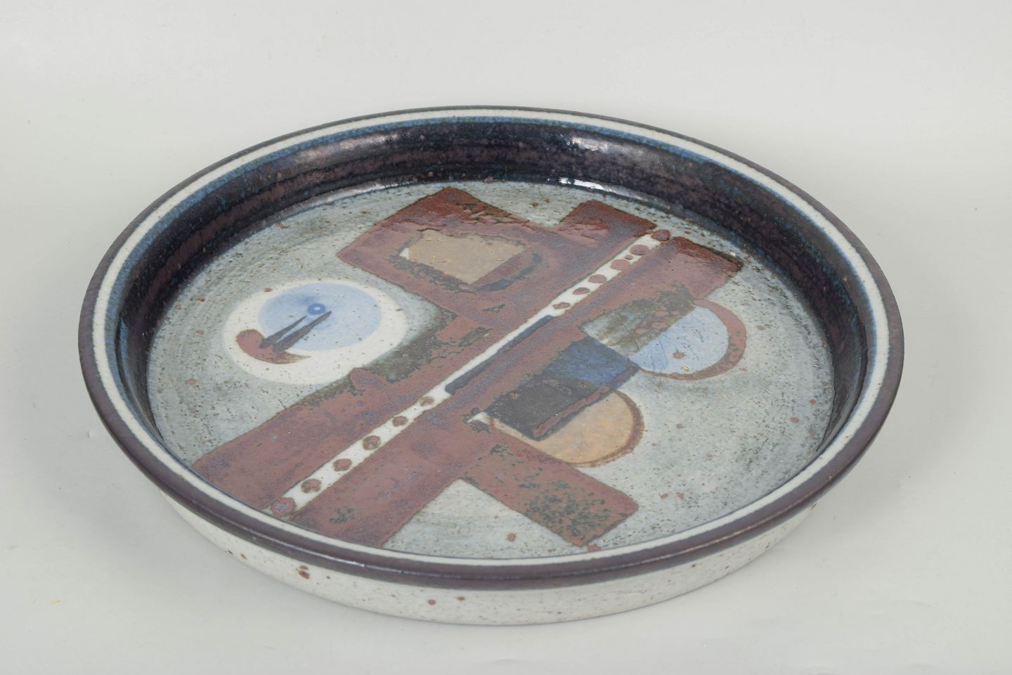Carl-Harry Stålhane for Rörstrand, Drejar-gruppen fad.Stort rundt fad i stentøj med kunstnerisk dekoration i geometriske former og jordfarvede nuancer. Model Drejar-gruppen, fremstillet 1976.
