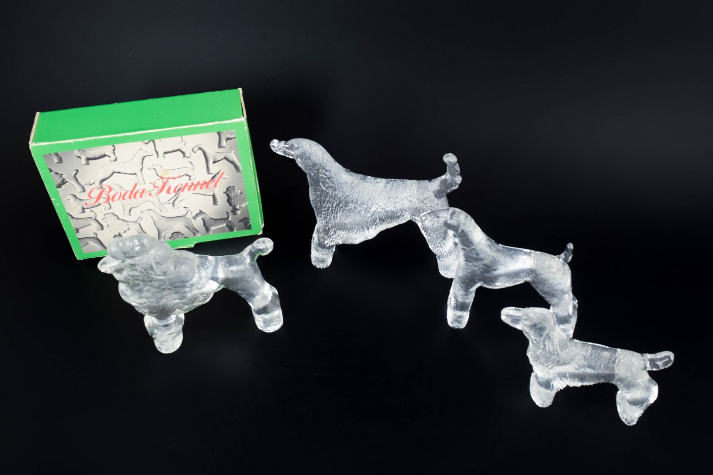 Bertil Vallien for Kosta Boda, sæt af fire hundefigurer “Kennel”.Sæt af fire skulpturelle hundefigurer i klart kunstglas med struktureret overflade, formgivet af Bertil Vallien for Kosta Boda. Figurenes organiske former og lette mattering giver et levende og karakterfuldt udtryk. Én med original æske.