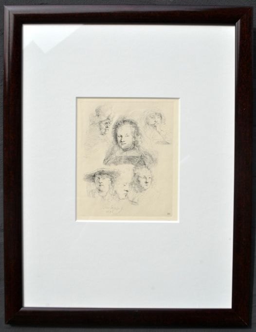 Rembrandt van Rijn (1606–1669), Niederlande: Studienblatt mit sechs Köpfen, darunter ein Porträt von Saskia, Nachdruck. Radierung. Signiert. Höhe: 15,5 cm. Breite: 13 cm.Gerahmt: H: 44 cm. B: 34 cm.