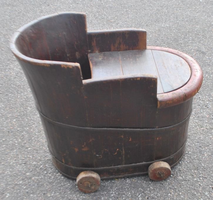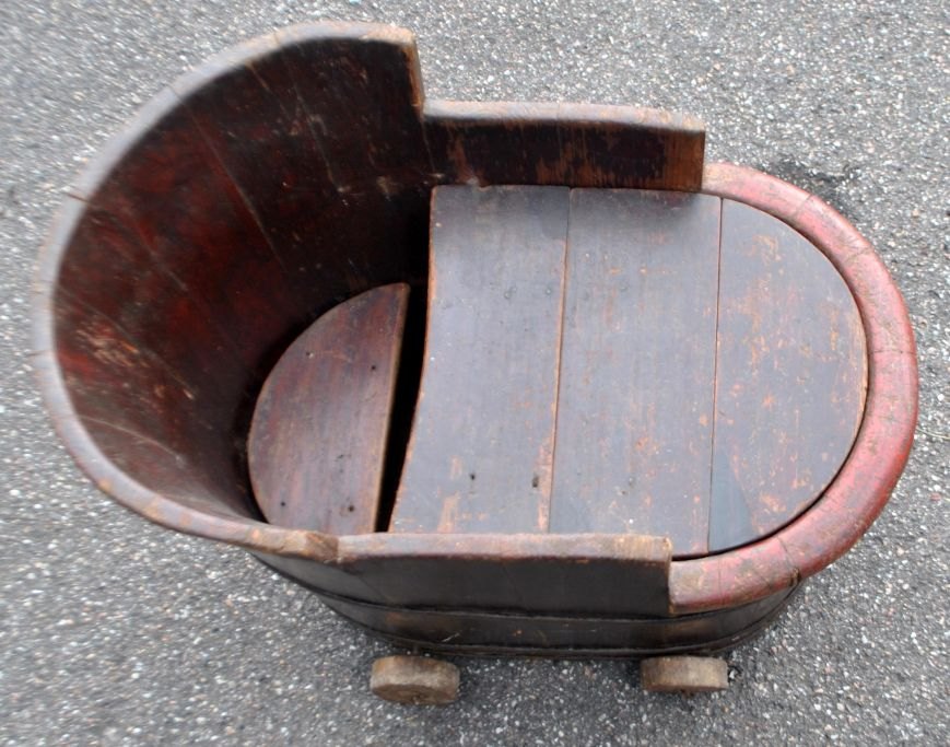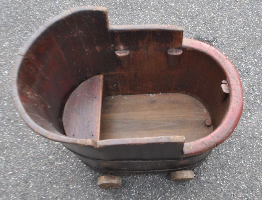 Kinderbadewanne, 19. Jahrhundert. Verleimtes, bemaltes Holz. Mit Fassband. Auf 4 Rädern. Höhe: 51 cm. Länge: 61 cm. Breite: 39 cm.Bestellnummer: 29186