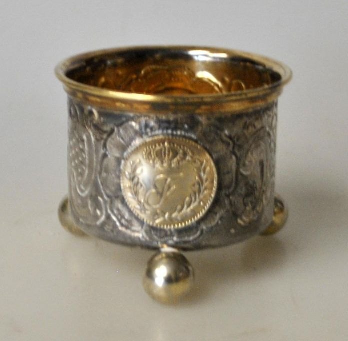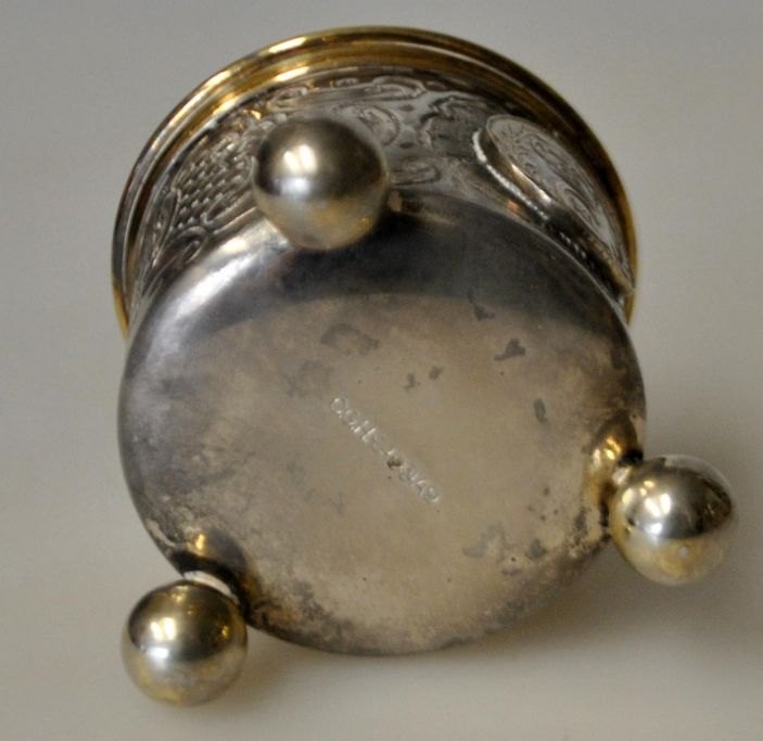 Schwedischer Silber trinbecher im Barockstil, 1951. Auf drei Kugelfüßen. Die Seite ist mit Rocailles und zwei schwedischen Einohrmünzen aus den Jahren 1694 bzw. 1722 verziert. Innen vergoldet. Gestempelt. Höhe: 4 cm. Durchmesser: 4,5 cm.