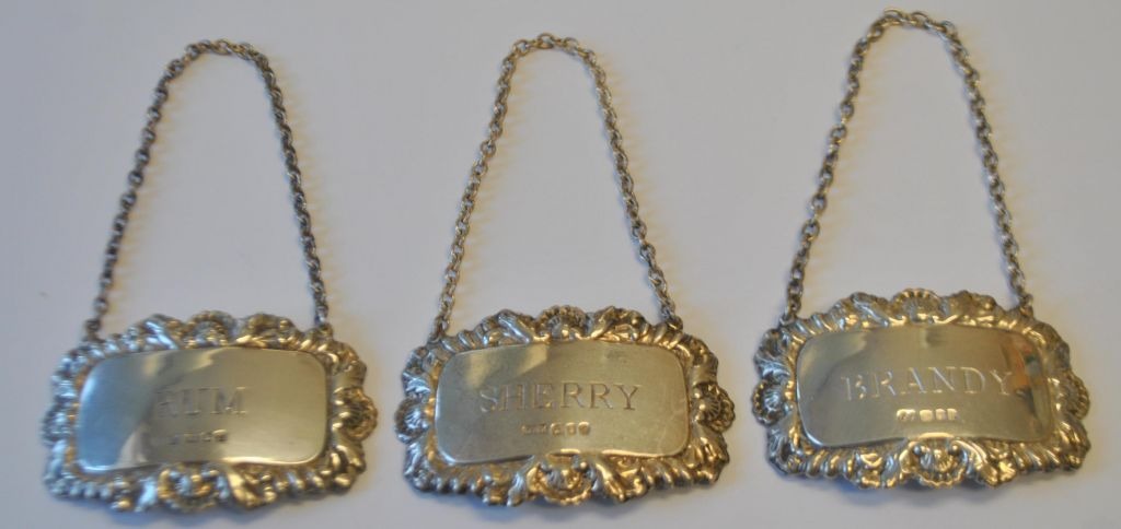 Silber Weinschilder, England, 19. Jahrhundert. Schilder für Rum, Sherry und Cognac. Gestempelt. Mit Kette und Randverzierung. 4 x 6,2 cm.Hinweis: Nur als Set erhältlich!