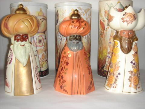 Mads Stage tegnede og udførte i midten af 1980'erne De hellige 3 konger Baltazar, Melchior og Kaspar for Imerco. Figurerne er håndmalet og belagt med 24 karat guld. På toppen af hatten sidder løs guldtop. Original metalæske til hver enkelt medfølger. Tv. Melchior, hvid/guld dragt, hvidt skæg. Lager: SOLGT