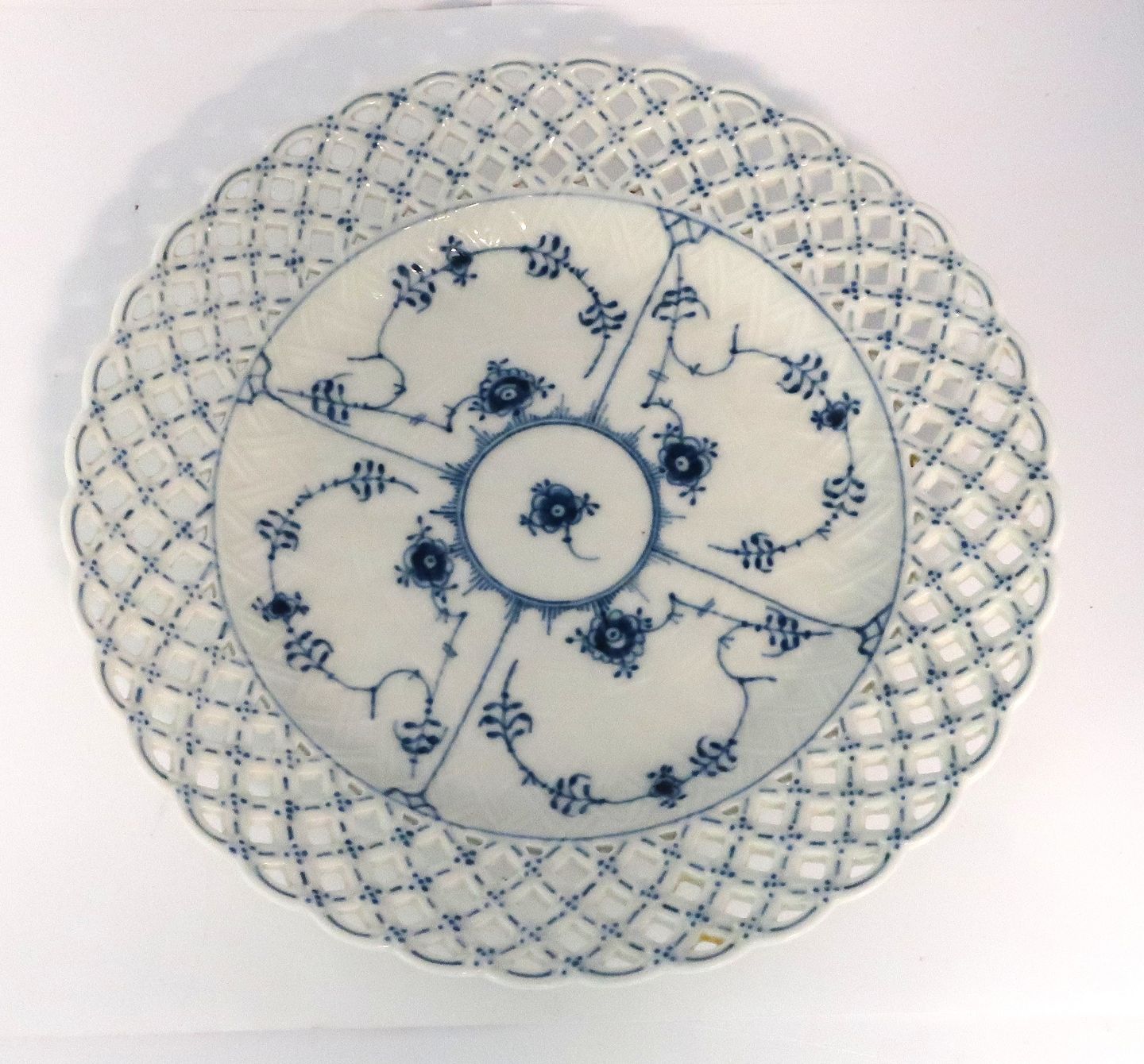 Royal Copenhagen. Musselmalet, Vollspitze. Flach mit durchbrochener Kante. Modell 1098. Durchmesser 25,5 cm. (4 Wahl).
