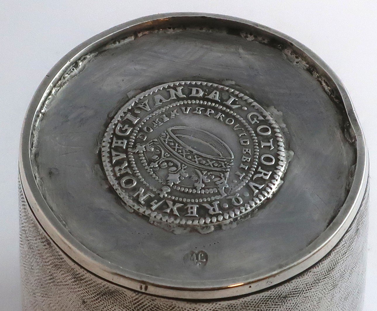 Mogens Thommesen Löwenhertz (1669–1734). Großer Silberbecher. Im Boden eingelegte Münze (Krone Friedrichs III. von 1651). Höhe 11,5 cm. Durchmesser 10 cm.