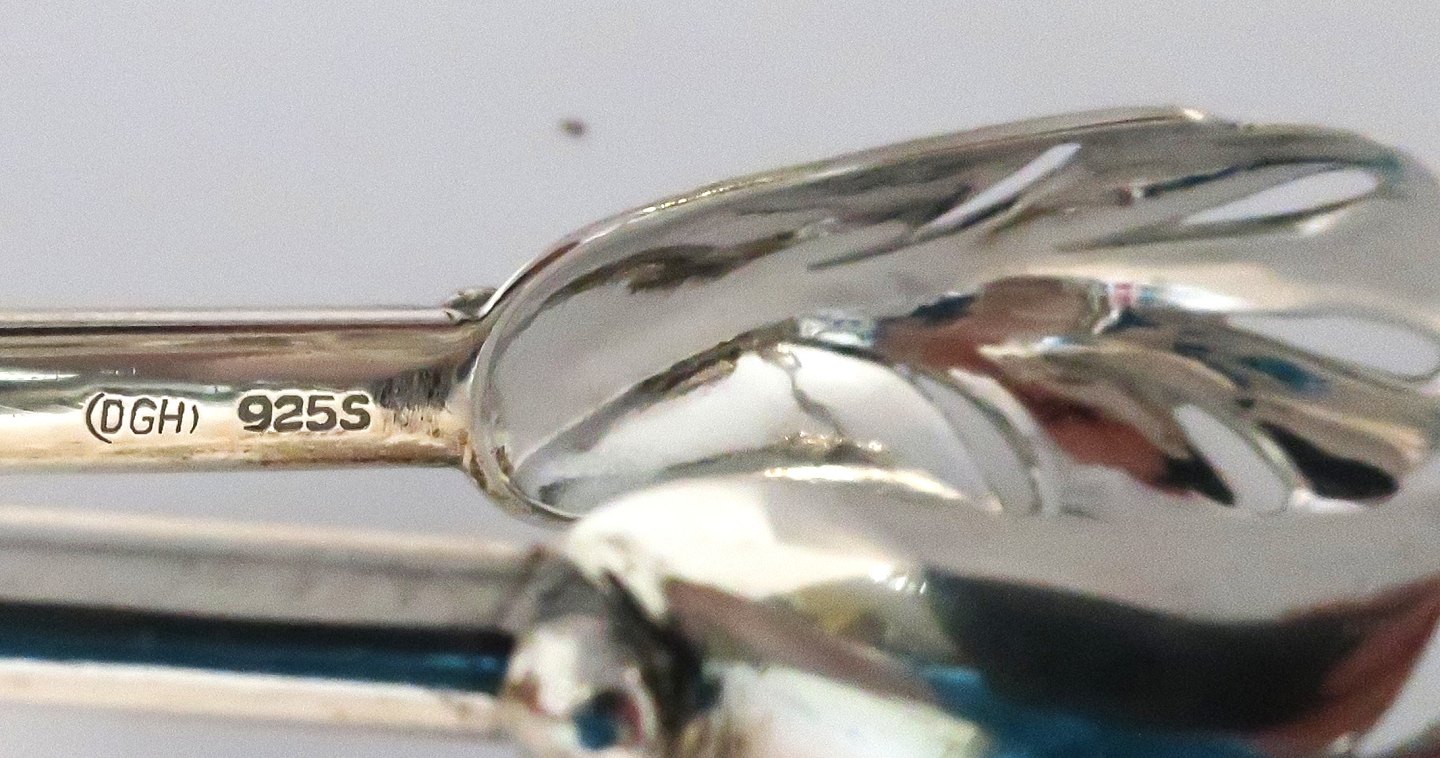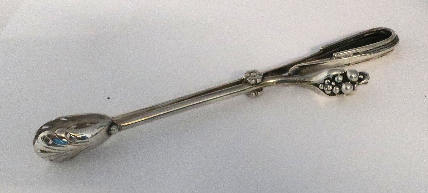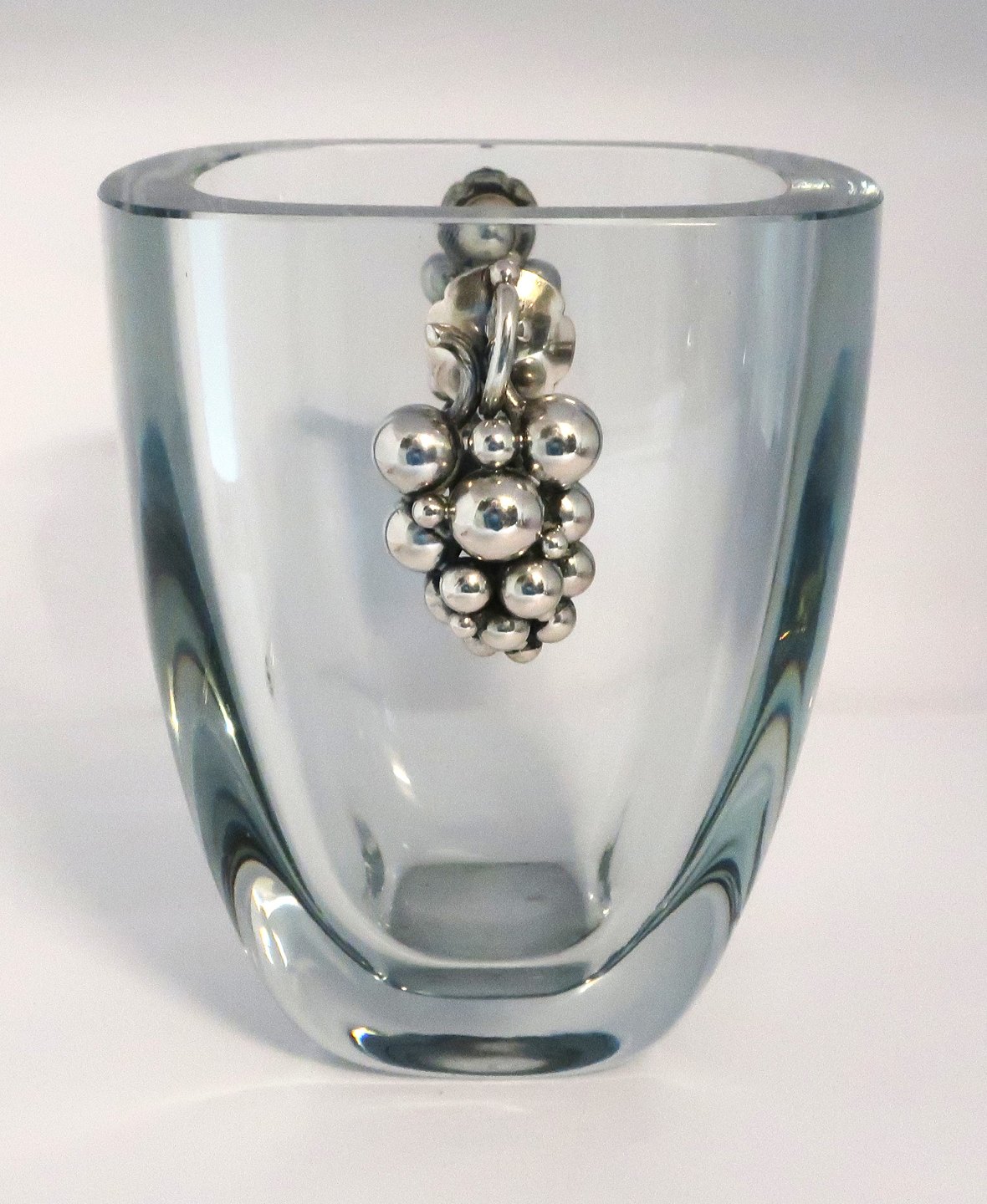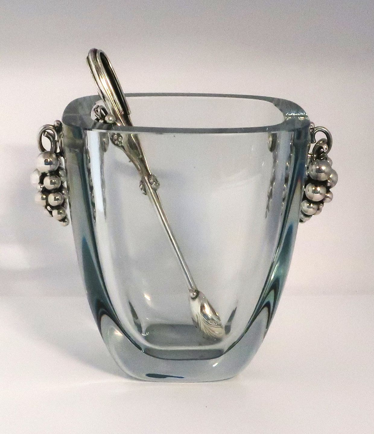 Danish Goldsmiths' Handicrafts, (DGH). Holmegaard ice bucket with sterling handle in the shape of a bunch of grapes. Height 15.5 cm. Width 13 cm. Includes matching ice tongs in sterling silver.