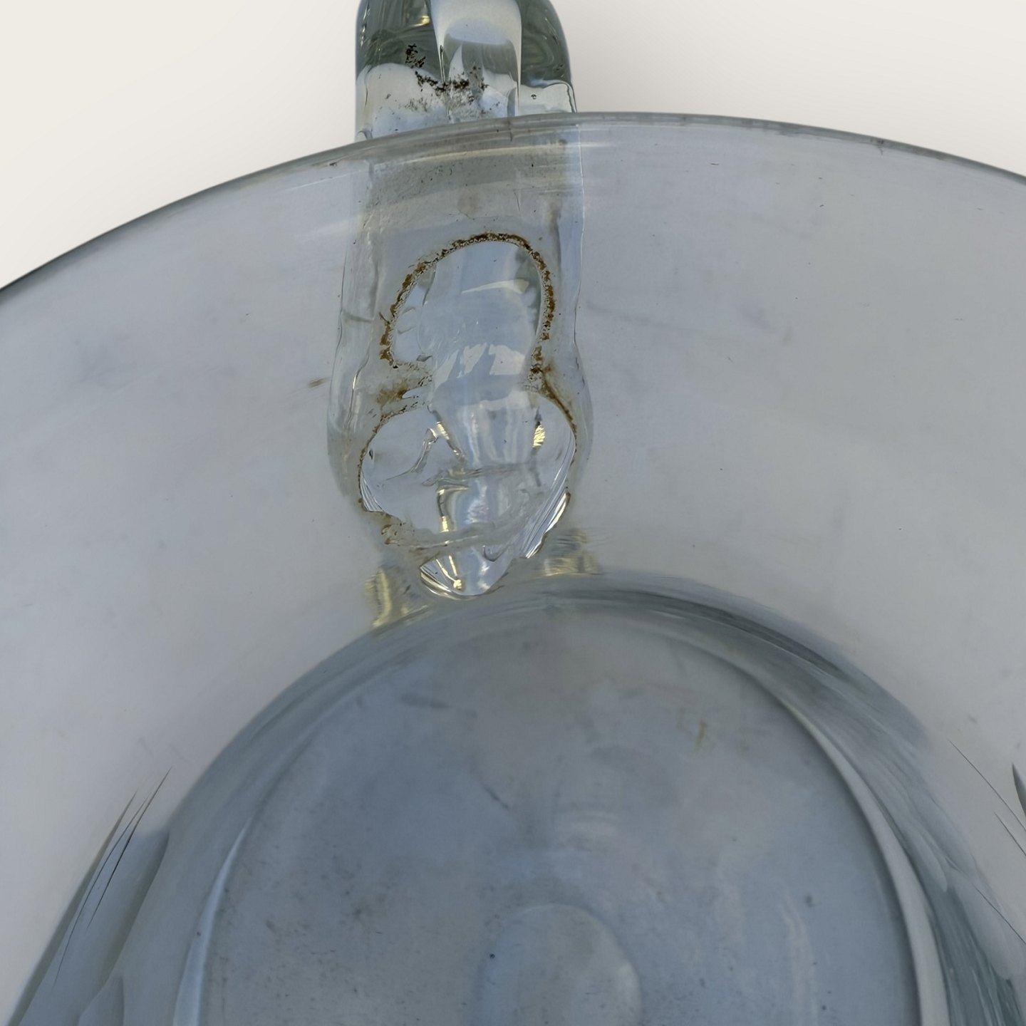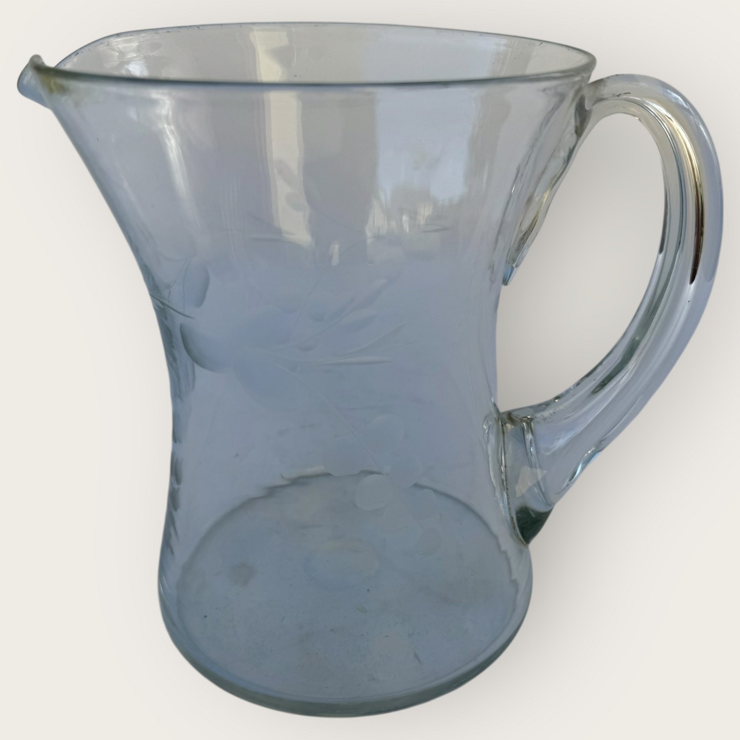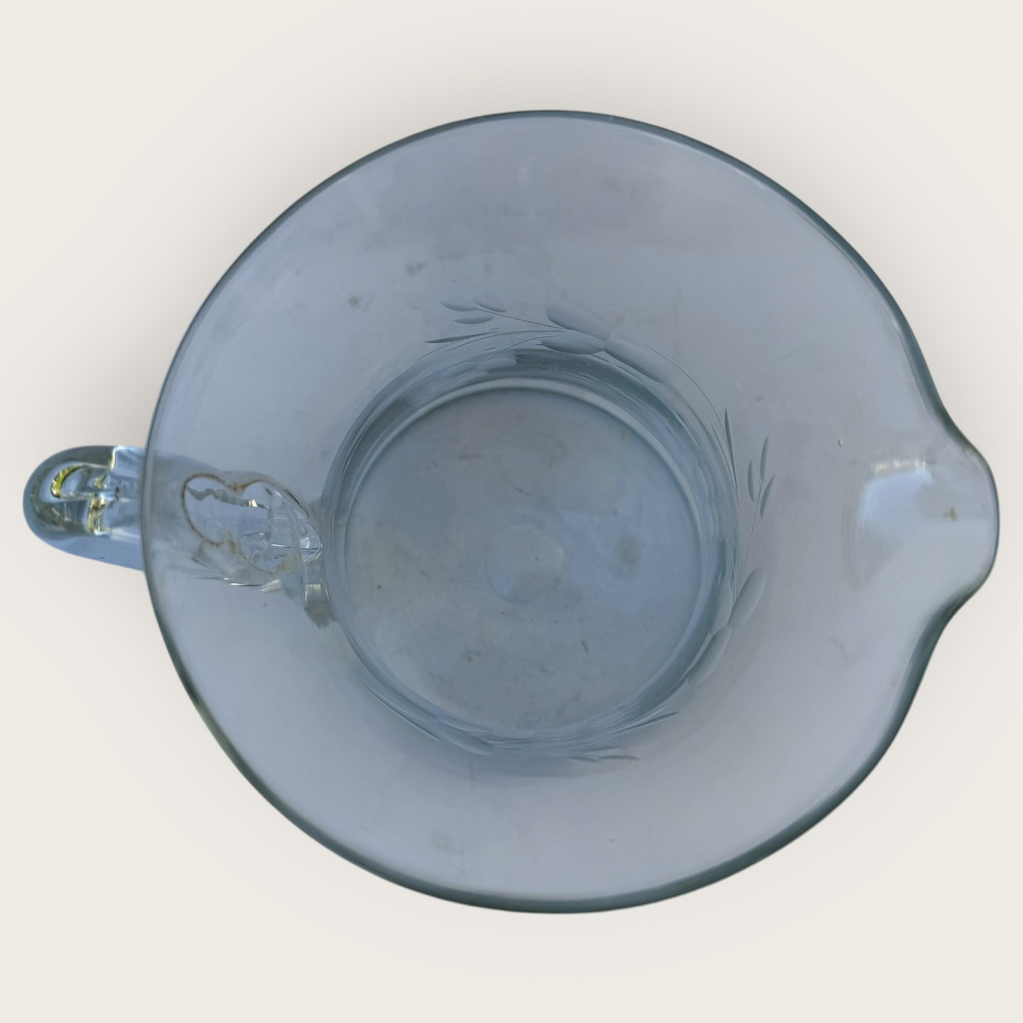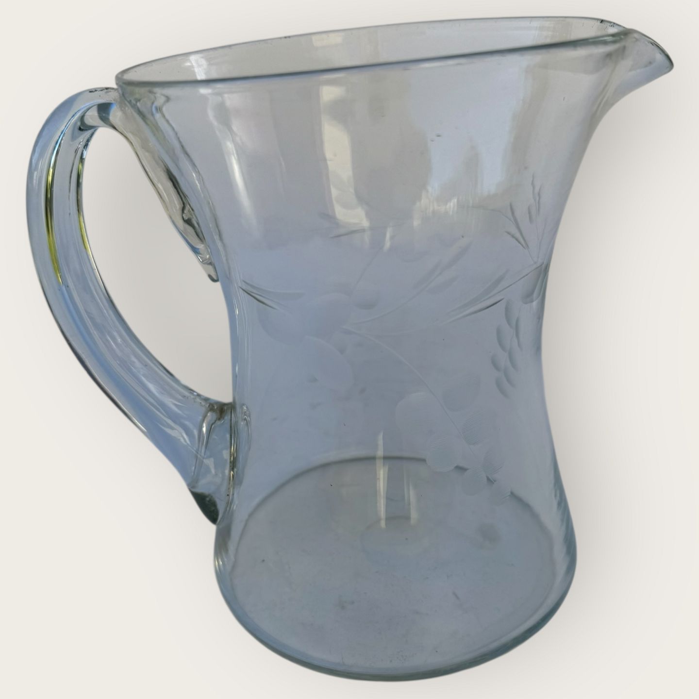 Breiter Glaskrug mit feinen Schliffen, Maße: HxBxT 17x19x13 cm, *Etwas Kalk an der Stelle, an der der Henkel am Krug befestigt ist (siehe Foto), sonst in gutem Zustand.