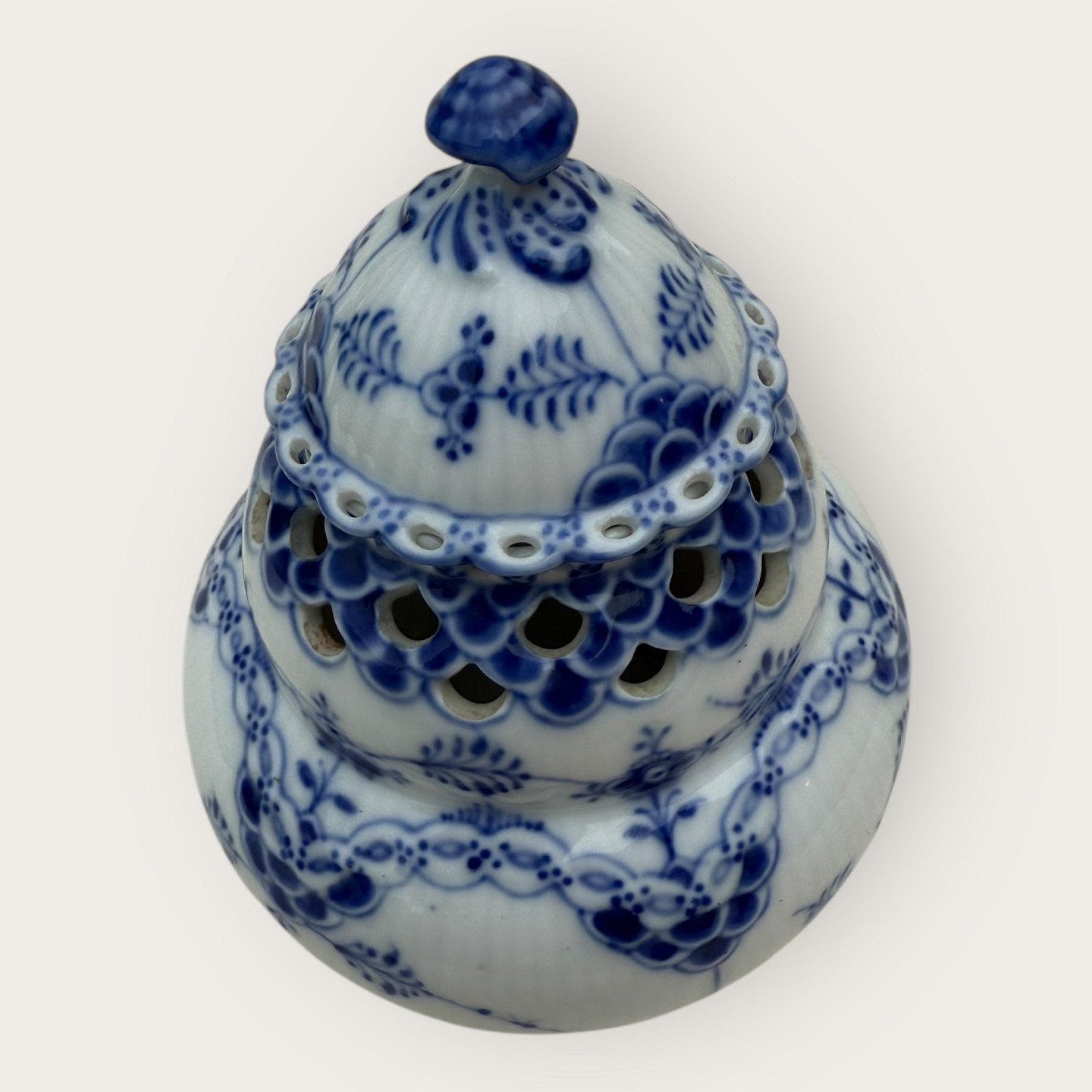Royal Copenhagen, Musselmalet-Vollspitze, Gefäß mit Deckel, Nr. 1/1186, Höhe 15 cm, Durchmesser 12 cm.