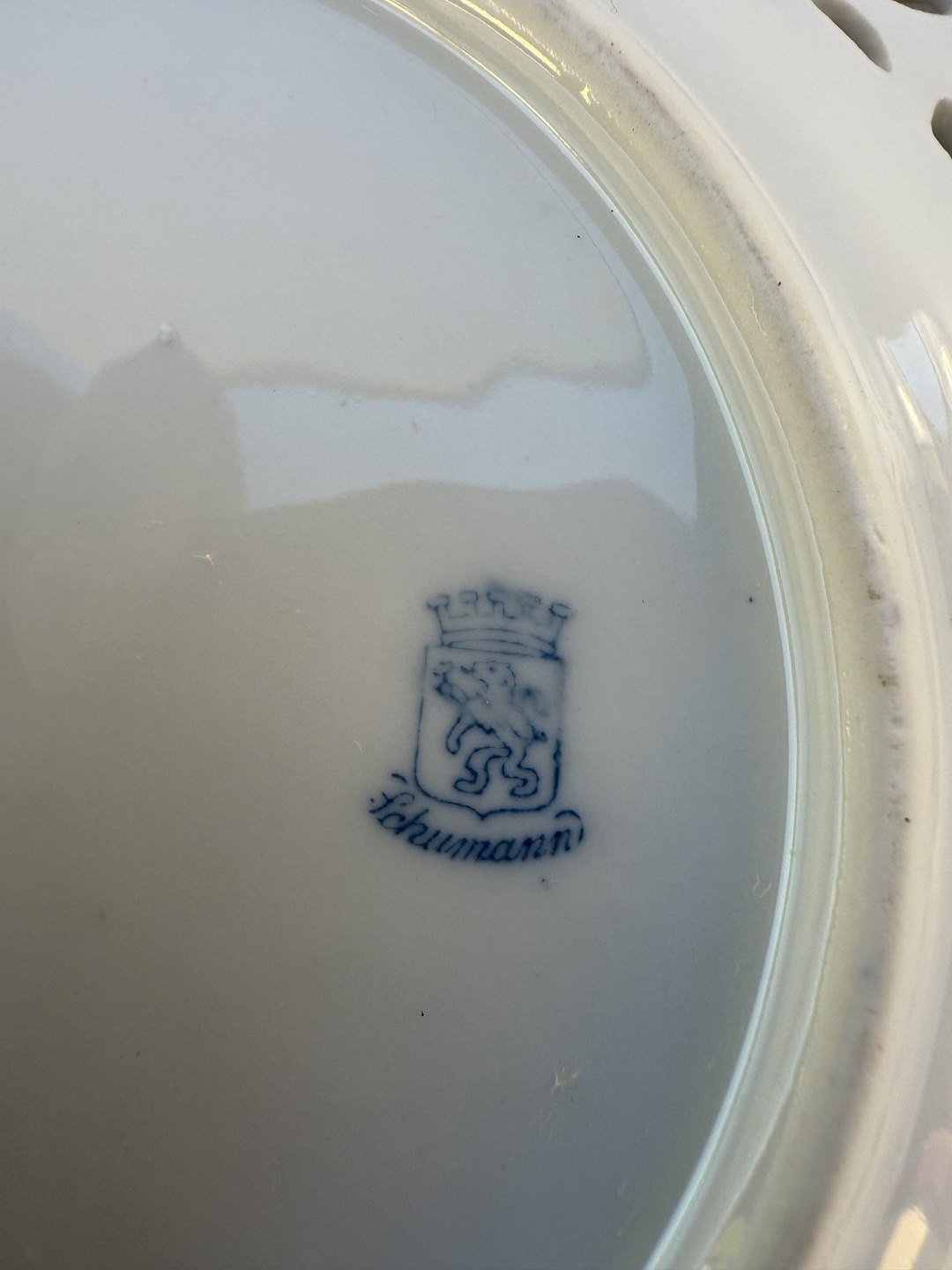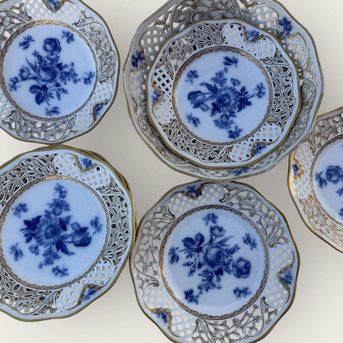 Schumann, Germany, Bowl and 8 plates with openwork rim, some wear on the bowl's gold rim, otherwise good condition, Plate diameter 19cm, Bowl diameter 23cm.