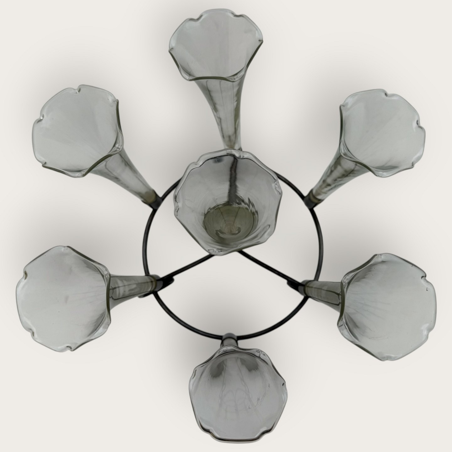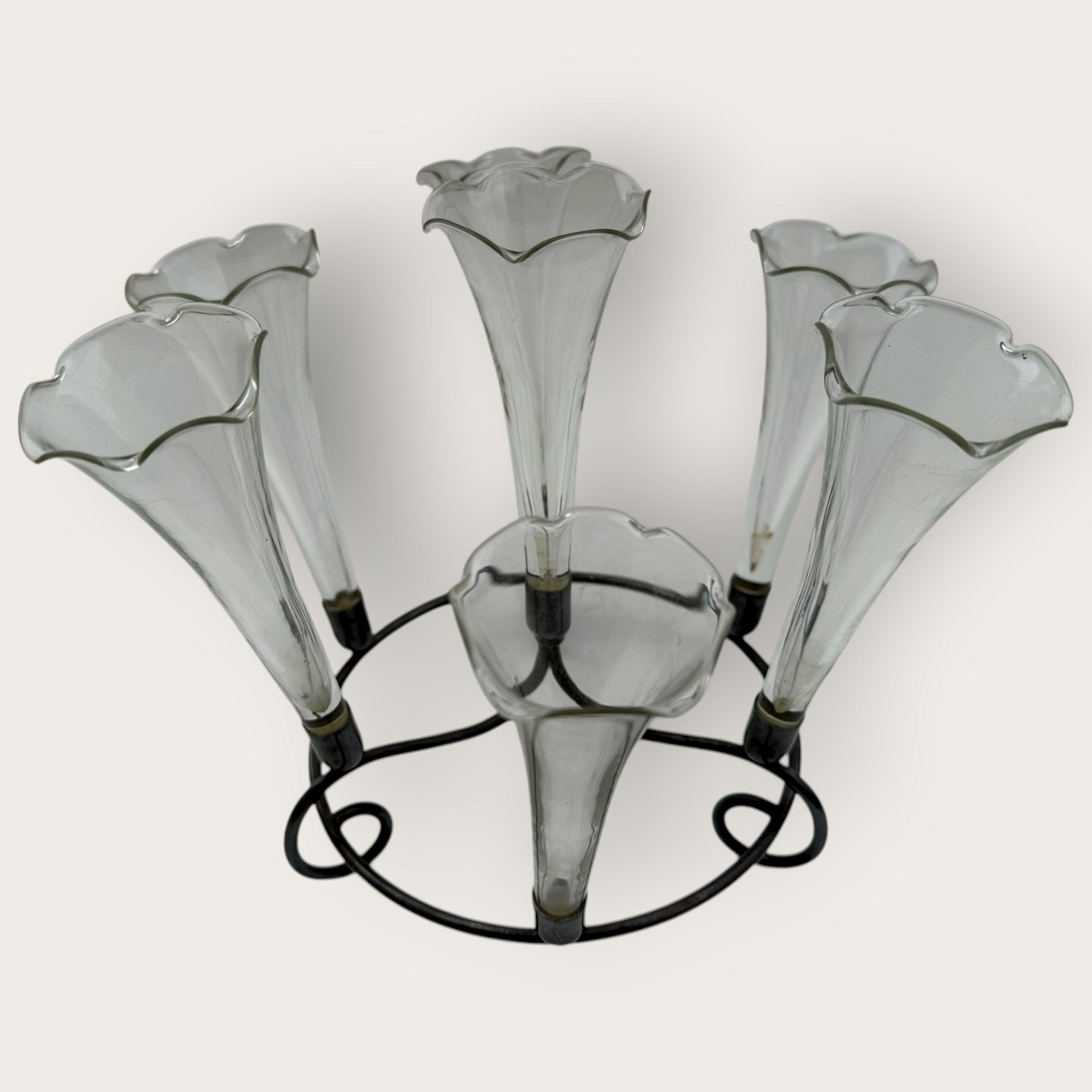 Epergne-Vase, Feines dünnes Glas mit gerüschtem Rand, alle Vasen mit versilberter Montierung, 7 Vasen in Jugendstil-Halterung, ca. 19cm hoch und 24cm im Durchmesser, jede Glasvase 13x5cm *Guter Zustand*