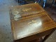 Der Tisch hatte einen Wasserschaden auf der Oberseite der Platte und an den Klappen. Wir haben den Tisch restauriert und neue Intarsien eingelegt. Siehe Foto vor und nach.