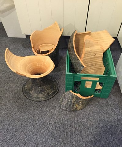 Große keramische Bodenvase, die wir repariert haben, nachdem sie in mehrere Teile zerbrochen war.