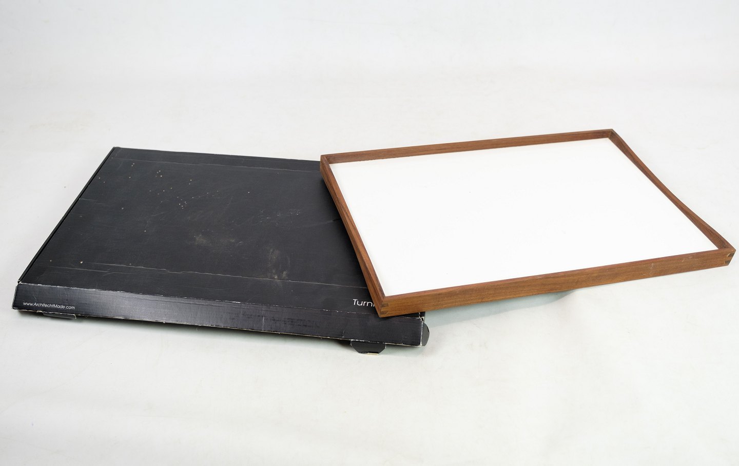 Drehteller von Finn Juhl, älteren Datums, aus Teakholz mit schönen Verbindungen, entworfen 1956. Farbgebung: Black Desert und Alaska White. Originalverpackung inklusive.