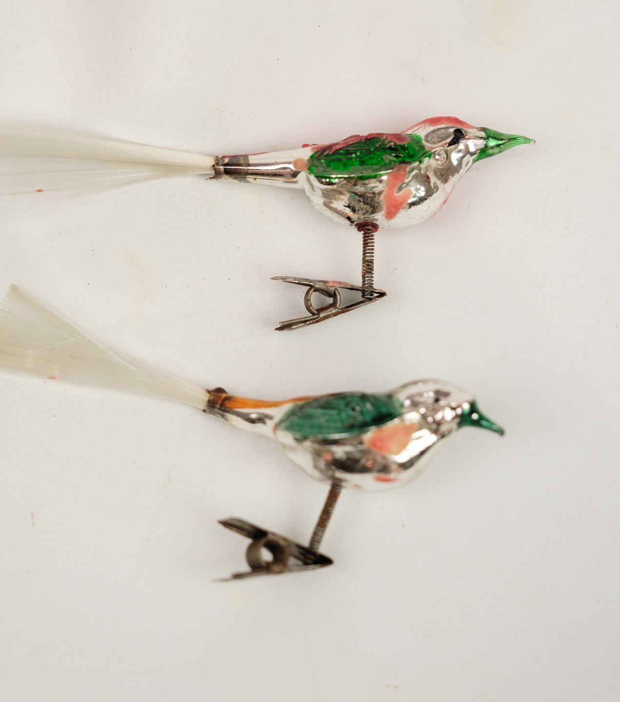 Ein Paar handbemalter Glasvögel aus den 1930er Jahren. Alter Weihnachtsschmuck in gutem Zustand.