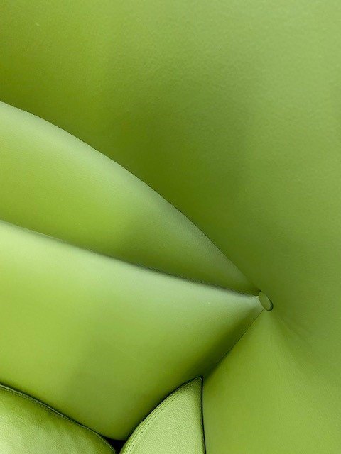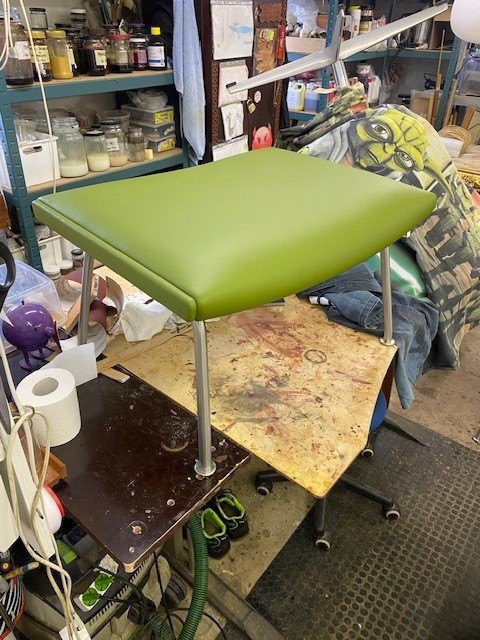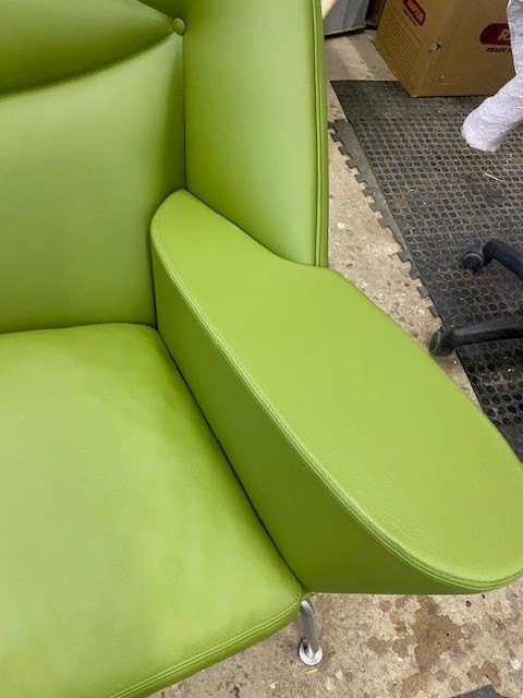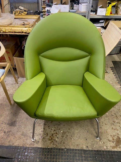 Der Stuhl wurde verkauft und anschließend von unseren eigenen Polsterern in grünem Leder von höchster Qualität neu gepolstert.