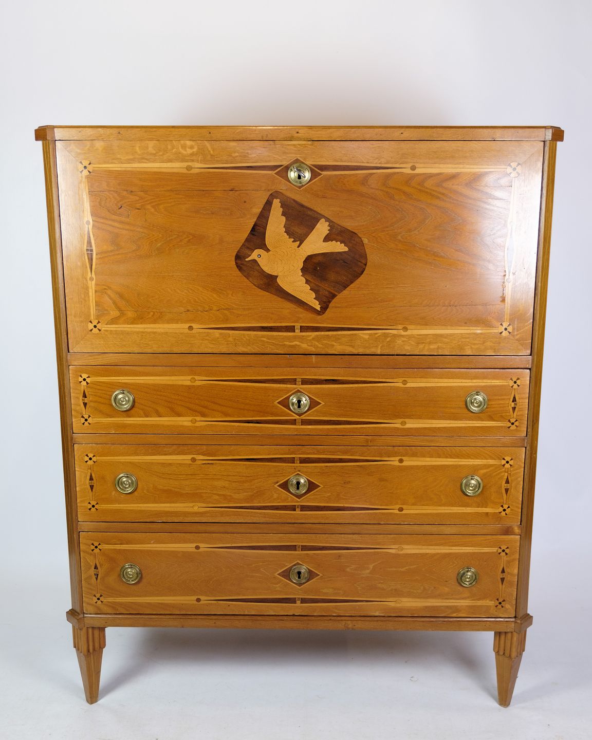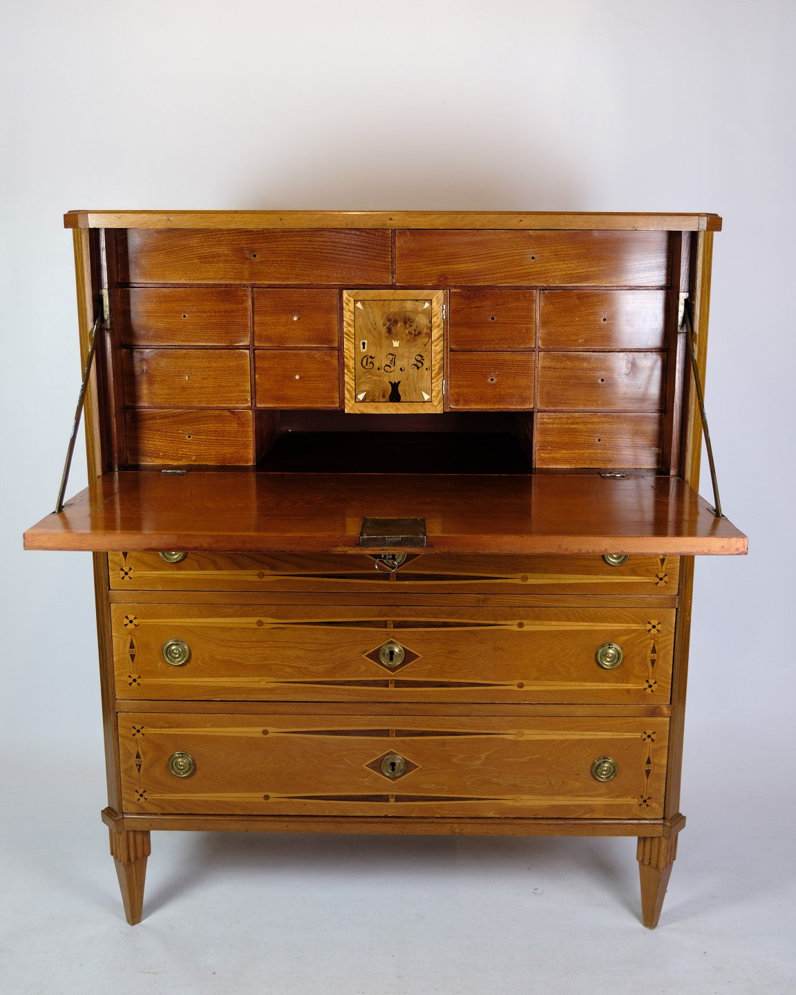 Sekretär aus Ulmenholz mit Intarsien aus Fruchtholz und Messinggriff, datiert um 1810.