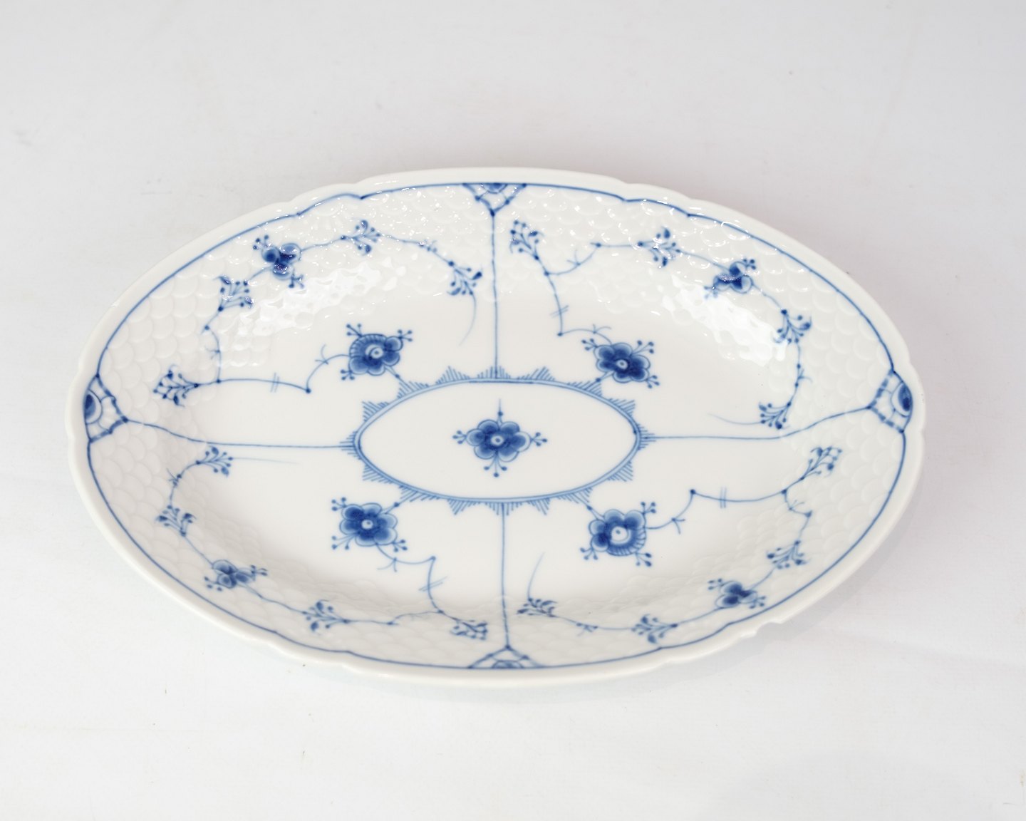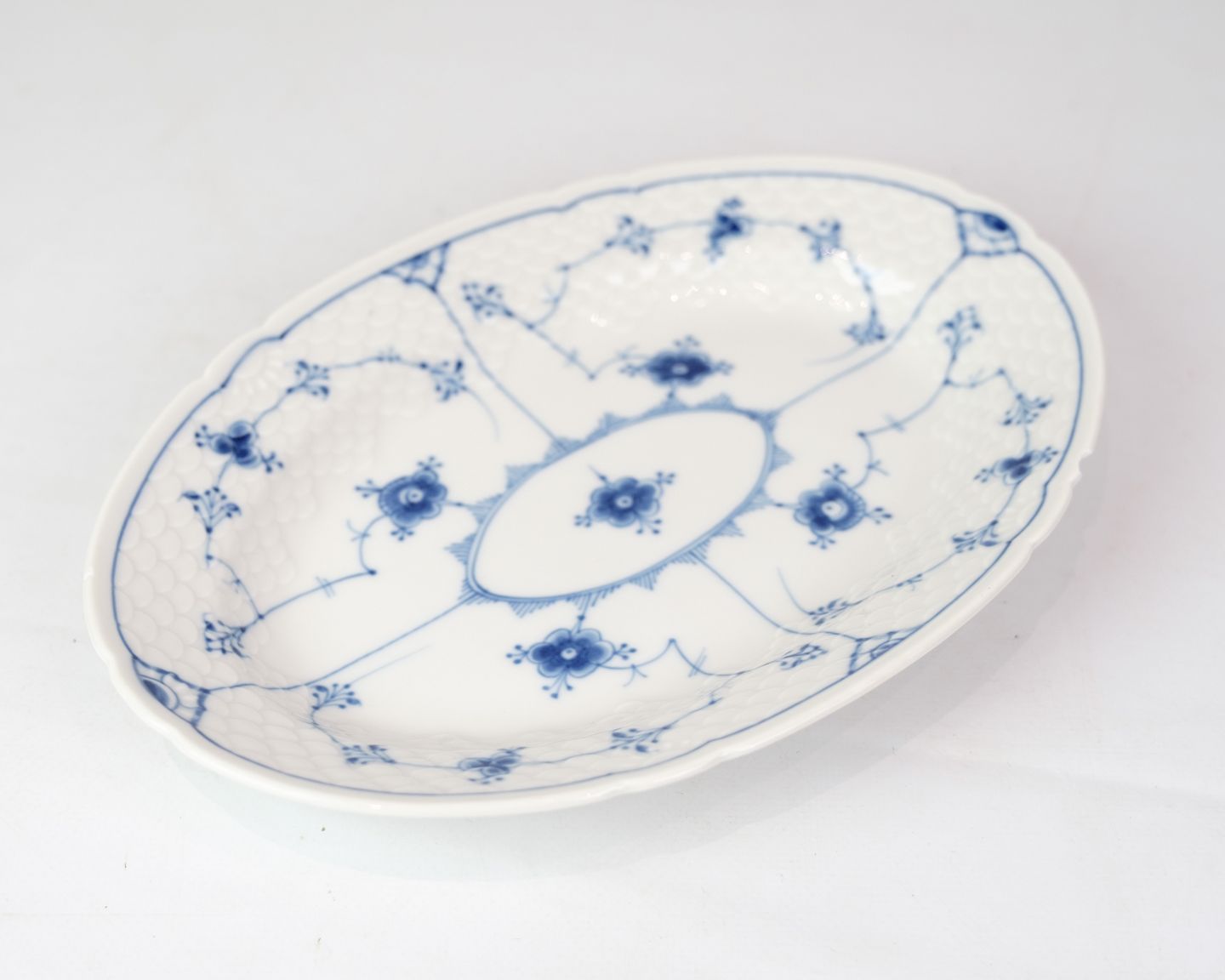 Ovale Schale Nr. 18 von Bing & Grondahl. Aus Porzellan mit klassischem Blau-gerillt-Design in handbemalter blauer Dekoration.
