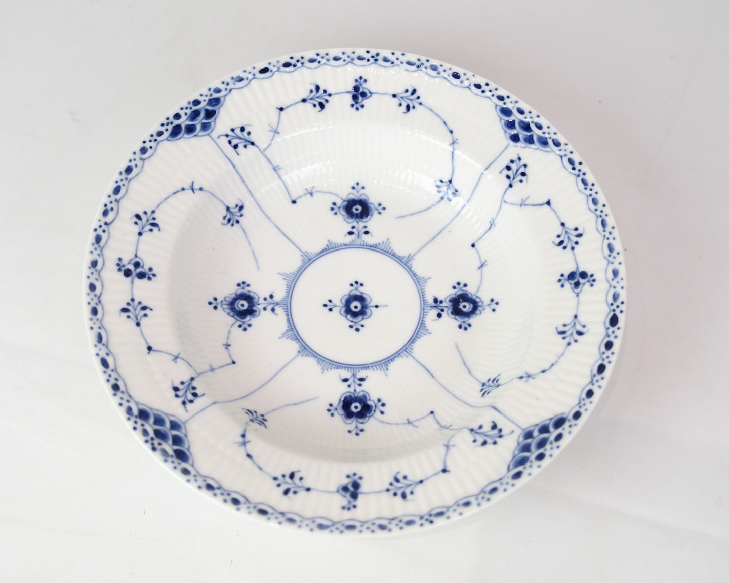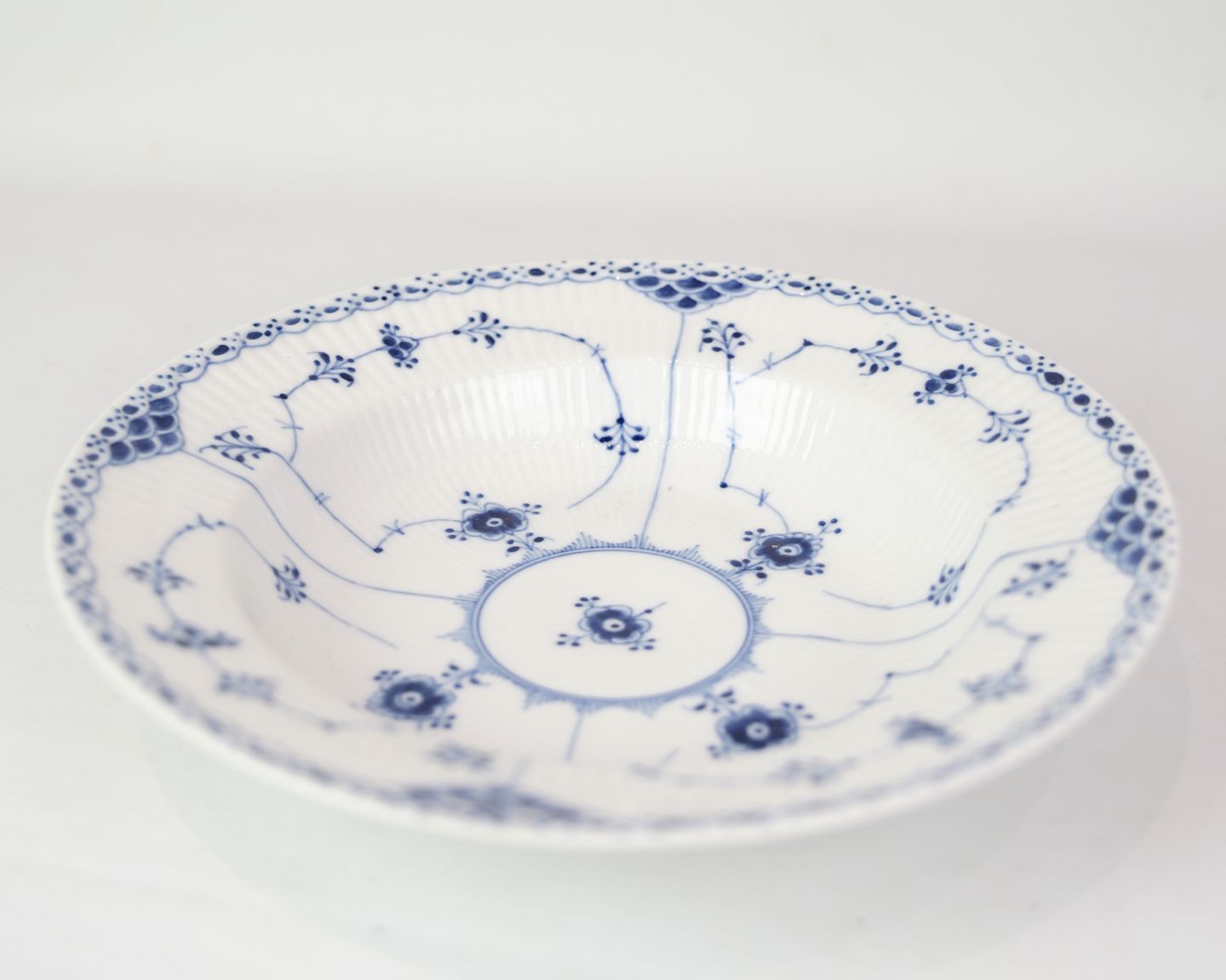 Tiefer Teller mit der Marke 1/659 von Royal Copenhagen, gefertigt im Dekor Blaue Gerippt Halbspitze. Der Teller ist aus Porzellan und mit blauer Dekoration handbemalt.