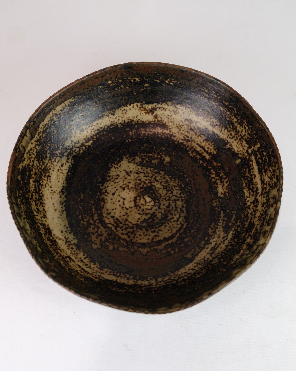 Schale Nr. 20722 aus Steinzeug mit Sung-Glasur, gefertigt von Axel Salto für Royal Copenhagen. Organische Form mit lebendiger Oberfläche und tiefer Glasur, charakteristisch für Saltos Stil. Auf der Unterseite mit „Salto“ signiert.