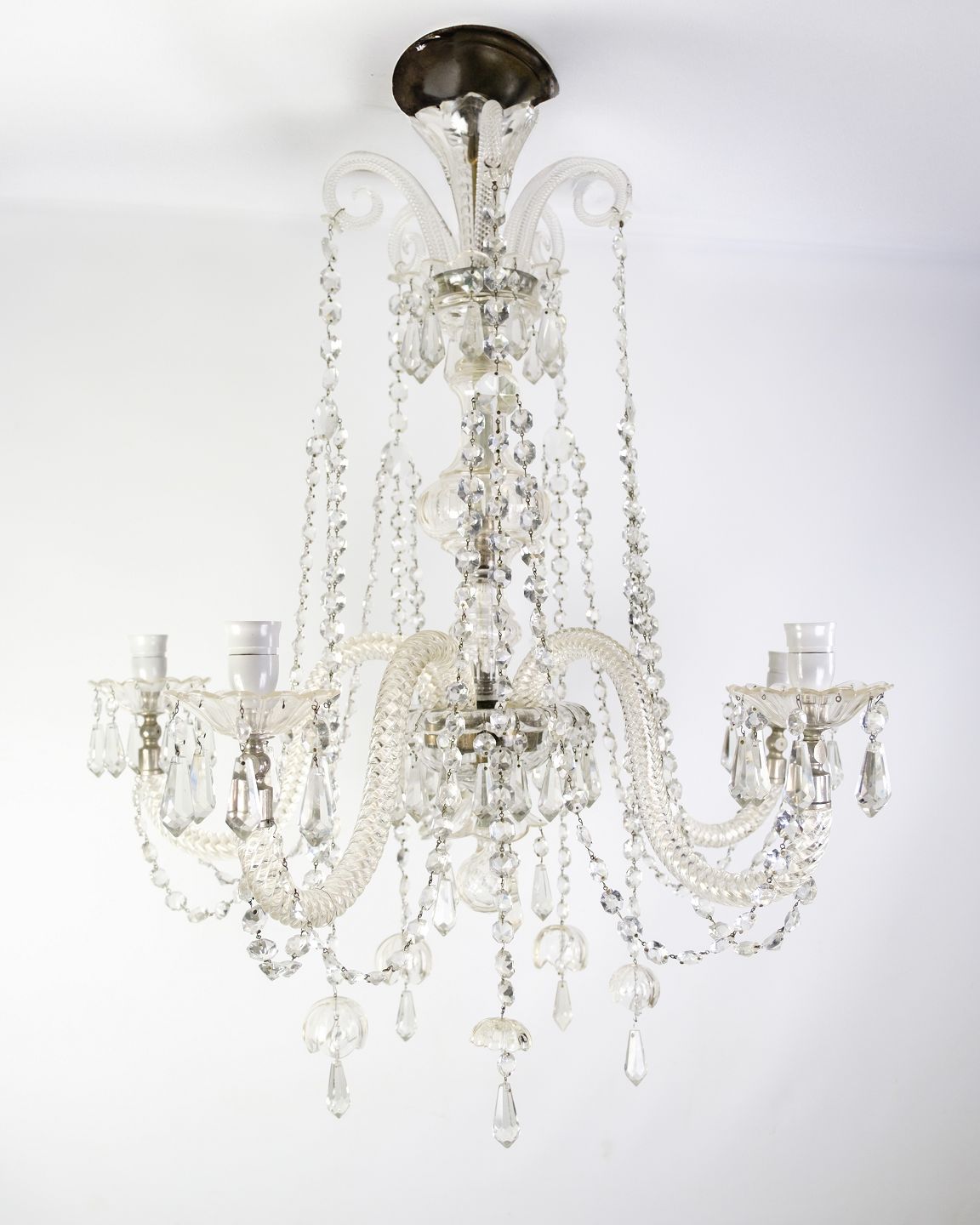 Großer Prismen-Kronleuchter mit fünf Glasarmen und elektrischem Leuchtmittel aus den 1930er Jahren. Hat viele schöne Prismen und befindet sich in sehr schönem antiken Zustand.