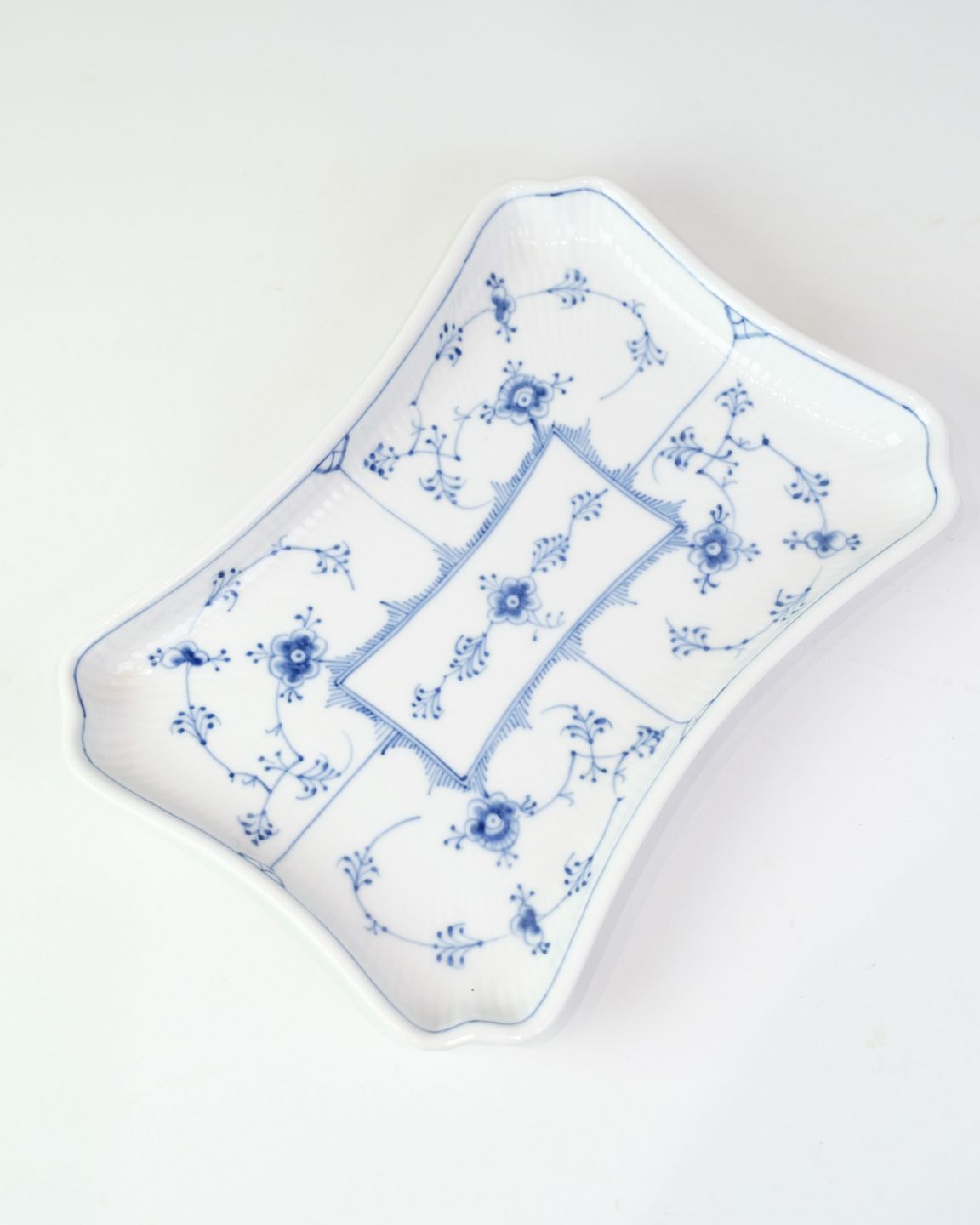 Elegantes Tablett von Royal Copenhagen im klassischen Blaue-Gerappt-Rahmen, entworfen von Arnold Krog. Aus handbemaltem Porzellan mit blauer Dekoration und der charakteristischen gerippten Oberfläche gefertigt. Das Modell ist Nr. 1/269 und erscheint in 1. Wahl.