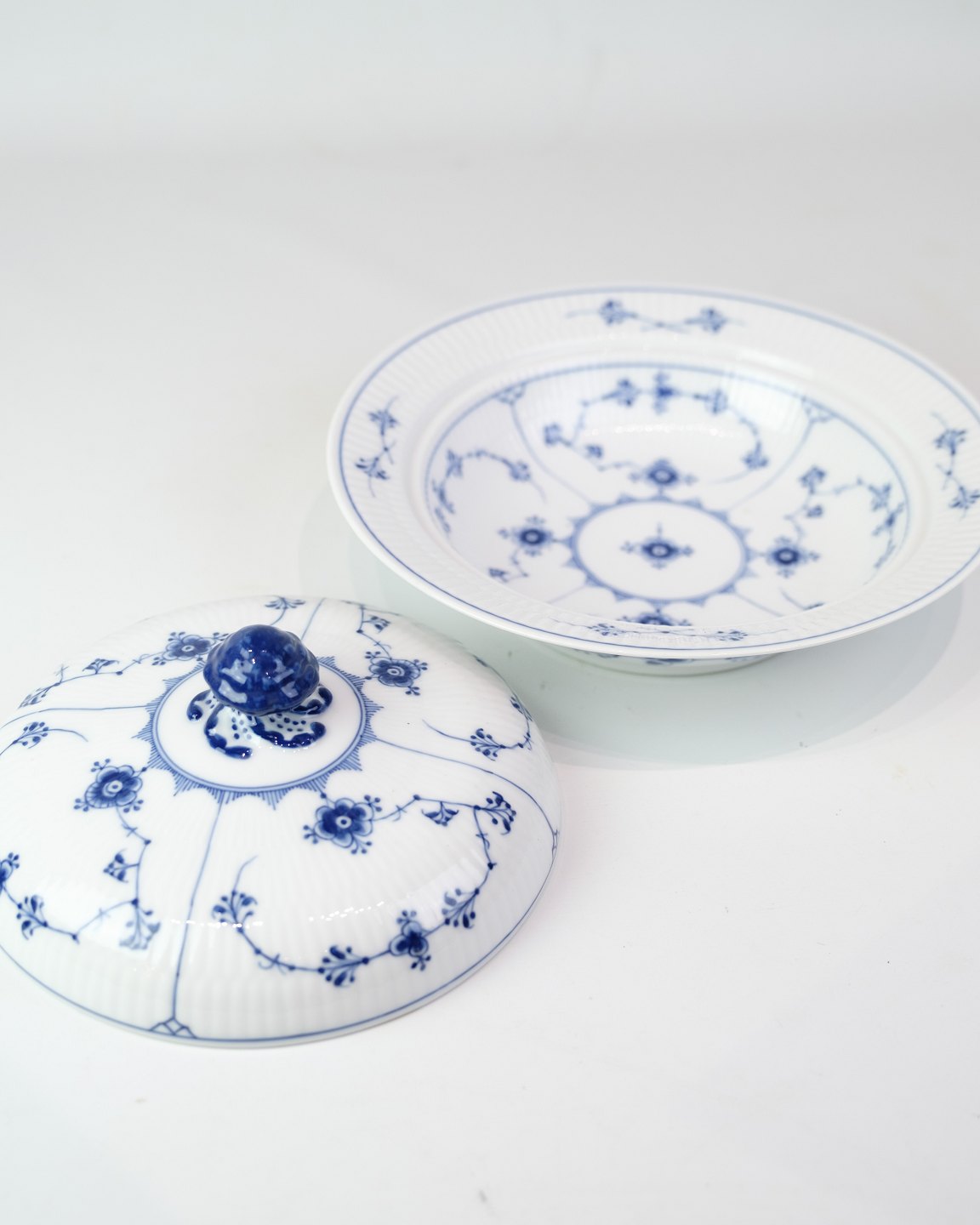 Elegante Deckelschale von Royal Copenhagen im klassischen Blaue-Gerappt-Dekor. Das Modell ist Nr. 272 und aus handbemaltem Porzellan mit kobaltblauer Dekoration und feinen gerippten Details gefertigt.