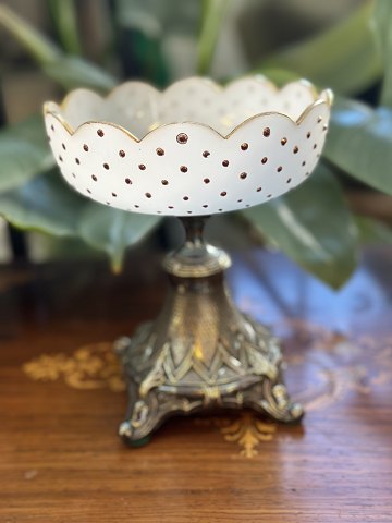 Vintage-Schale aus den 1800er-1900er Jahren, die Schale ist aus Opalglas (milchig weißes Glas) mit handgemalten goldenen Punkten und Goldrand, der Fuß ist versilbert mit dekorativen Jugendstil- und Barock-inspirierten Details, entworfenes Opalglas aus den späten 1800er Jahren
