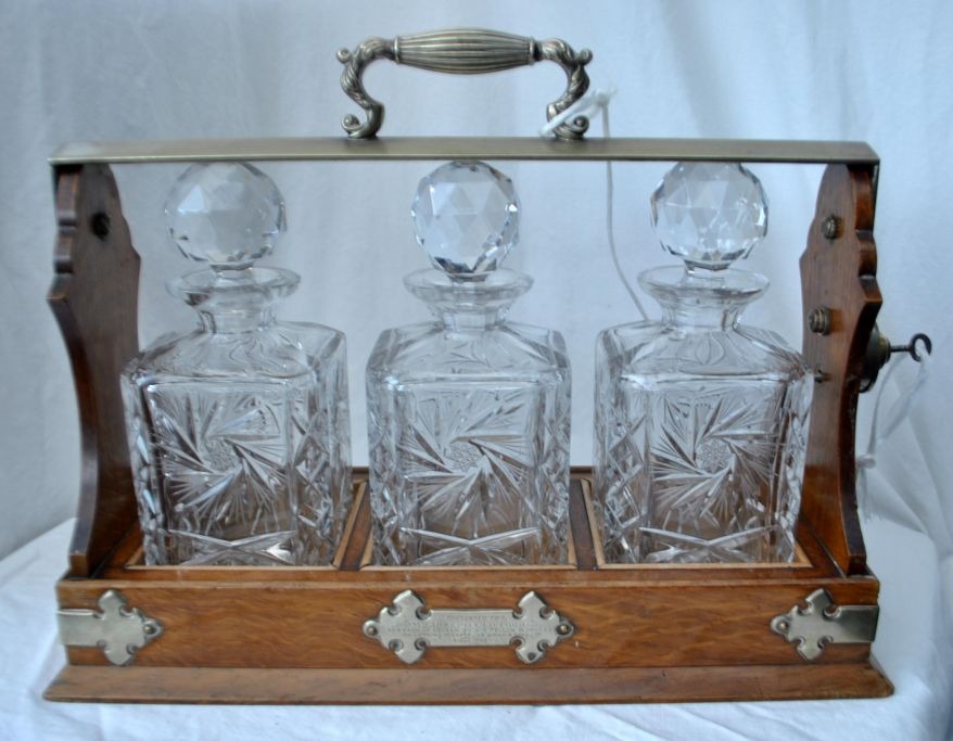 Englischer Tantalus mit drei Kristallkaraffen, 19. Jahrhundert.