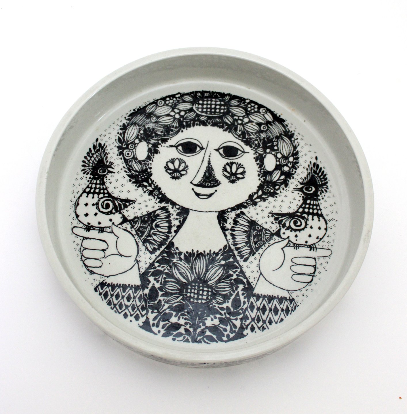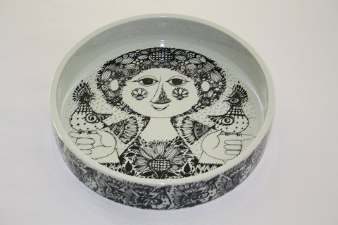 Frugtskål, Bjørn Wiinblad, Nymølle. Diameter 22 cm. Højde 4,5 cm. Der er lidt ujævnhed i glasuren på kanten ellers fin stand. Pris: 300 kr. stk. Lager: 1