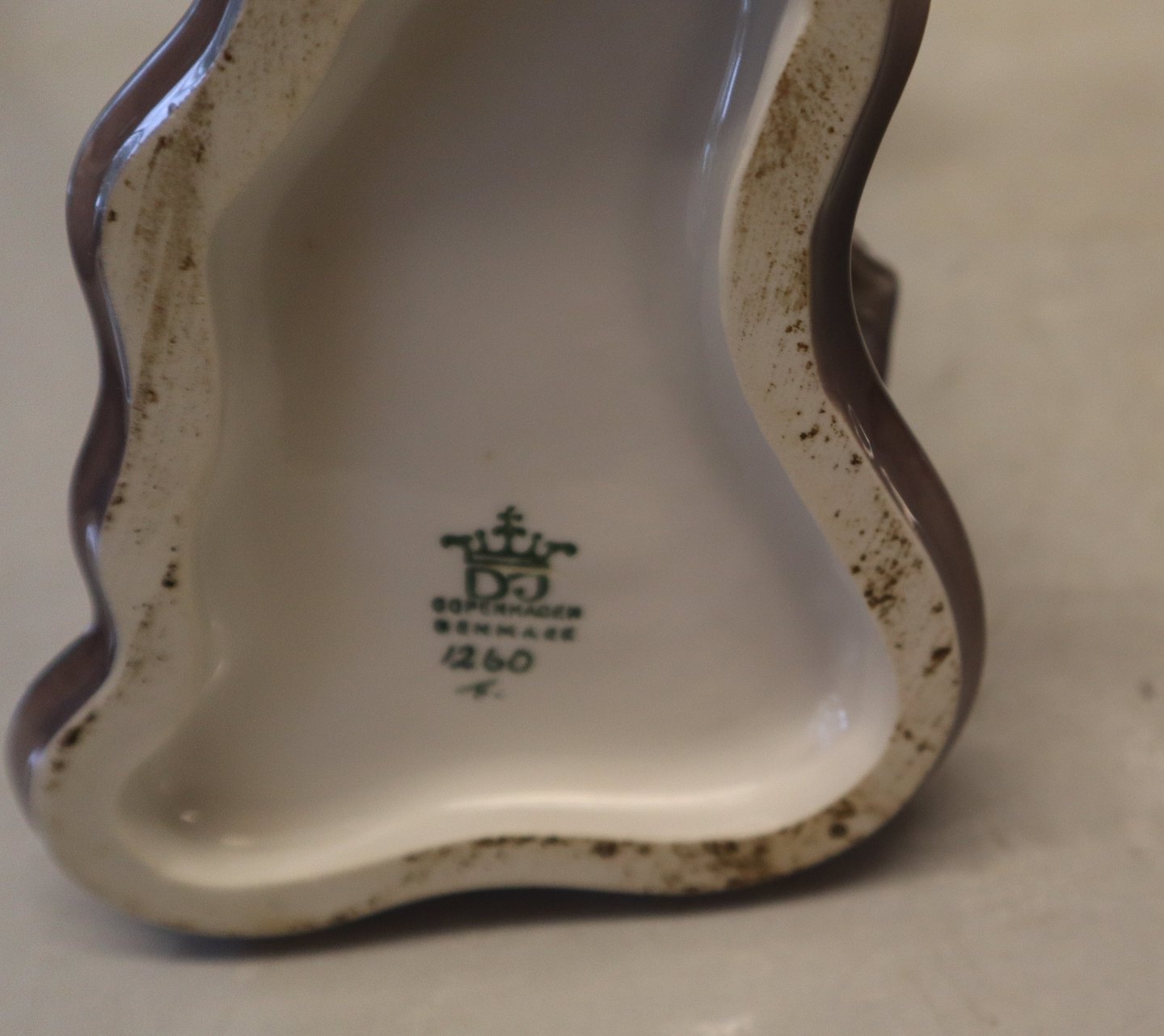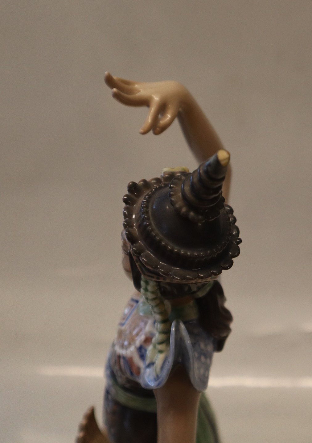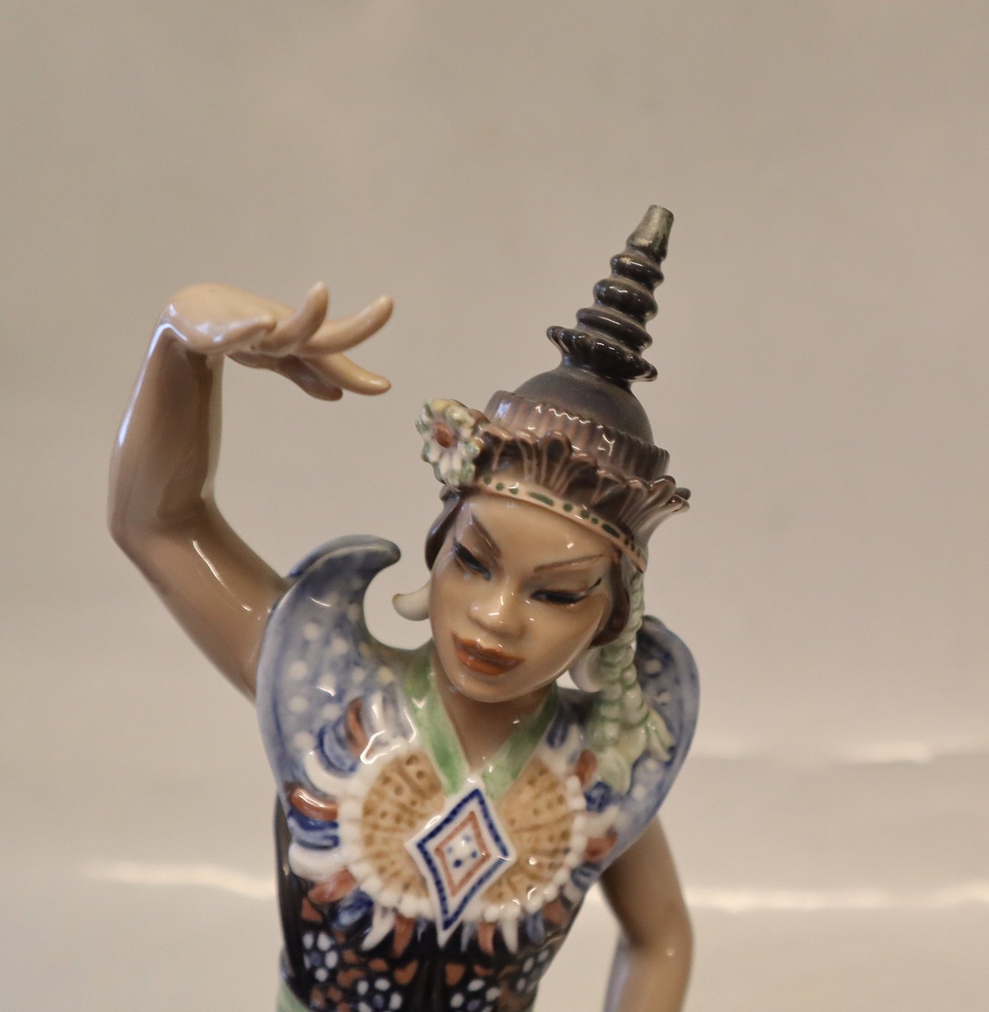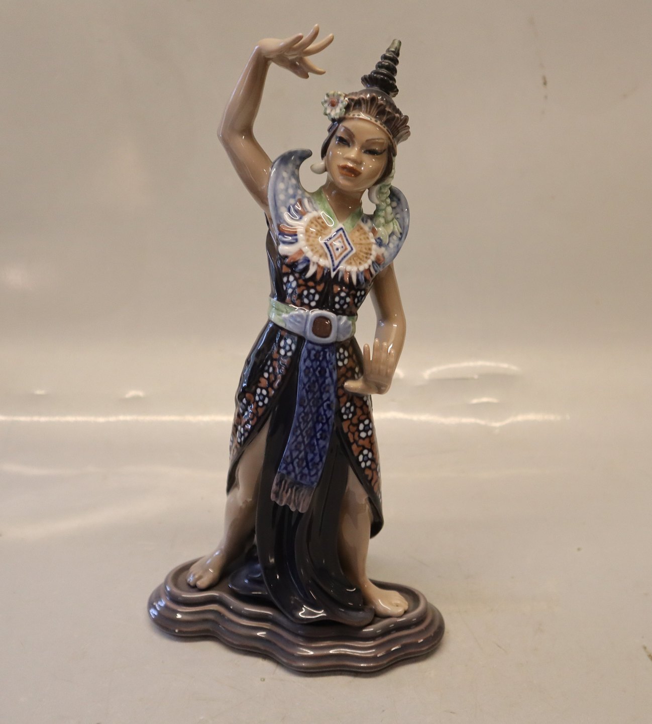 Dahl Jensen 1260 Indokinesisk tempeldanserinde 29 cm (DJ). From Thailand Mærket med kongelig krone og DJ Copenhagen i hel og fin stand bortset fra en brændingsrevne på undersiden - se billeder