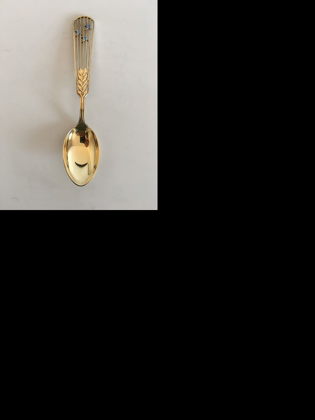Anton Michelsen Juleske 1937 Forgyldt Sterling Sølv med EmaljeArkitekt Palle Suenson har taget et enkelt aks ud af juleneget og dannet skaftet ud fra akset form. Bygakset er genkendeligt med kerner og lange vipper, hvor i tre små fugle udgør den eneste yderligere dekoration.