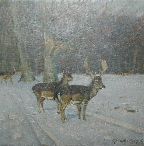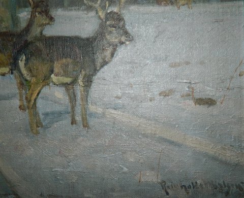 VINTERMOTIV FRA DYREHAVEN: Oliemaleri på lærred (opklæbet på karton) med rådyr i Dyrehaven. Malet af Knud Reinholdt Nielsen (1891-1984). Fremstår i god stand. Guldrammen med lidt afskalninger. Mål uden ramme 32 cm x 32 cm. Mål incl. ramme: 42½ cm x 42½ cm.