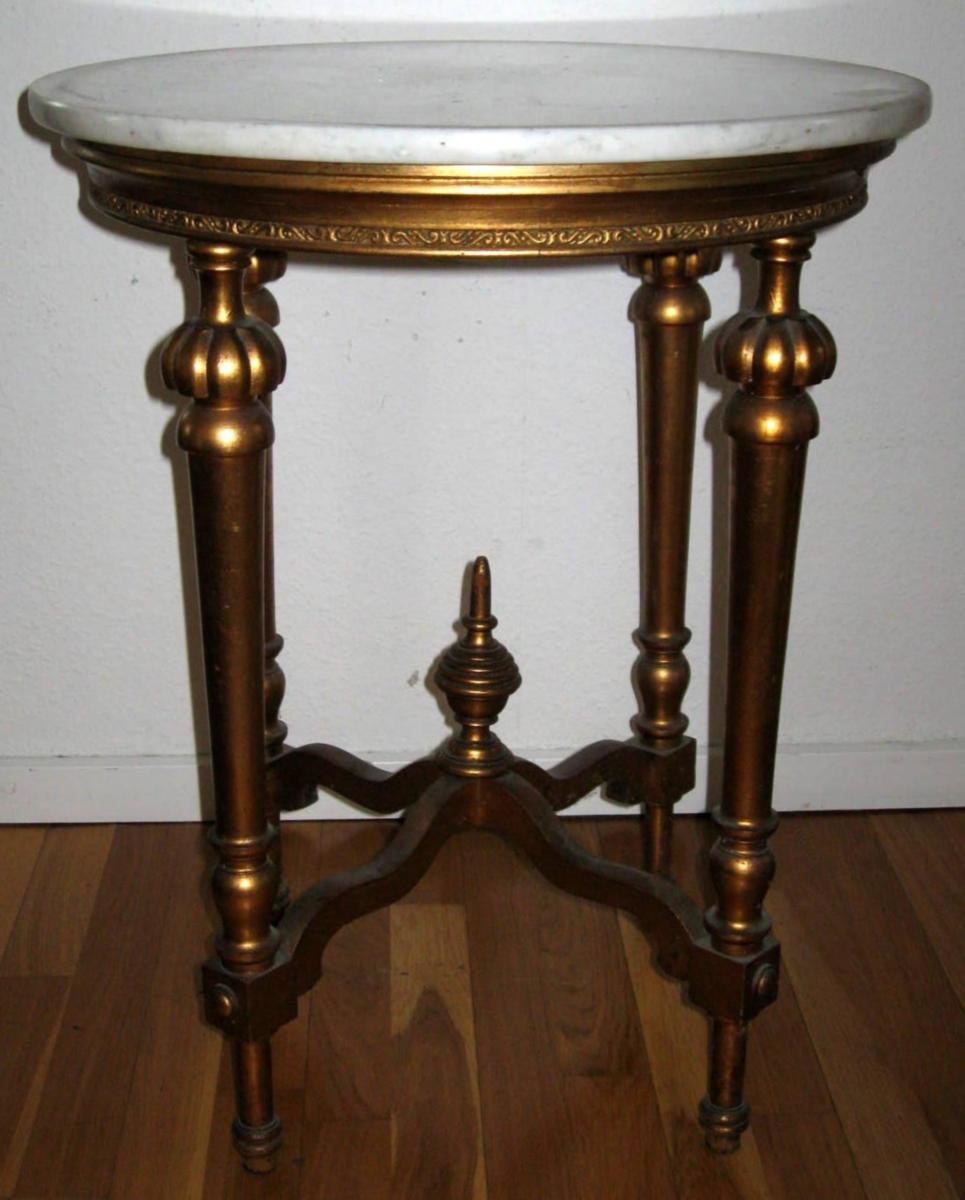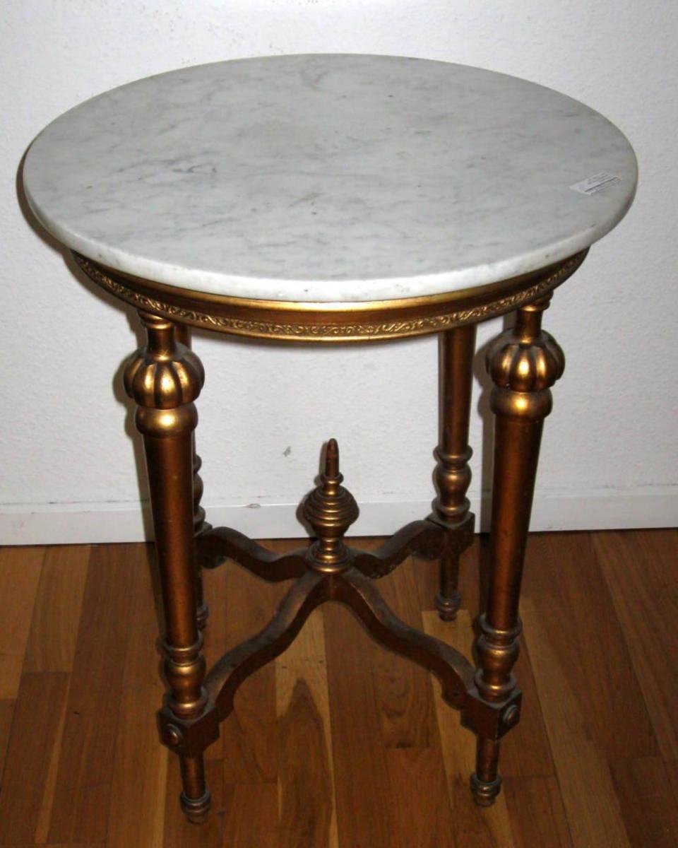 Französischer vergoldeter Tisch mit Marmorplatte, 19. Jahrhundert. Gedrehten Beinen mit Dekorationen. Randdekoration. H:. 72 cm. Dia. Platte.: 58 cm.Bestellnummer: 5771